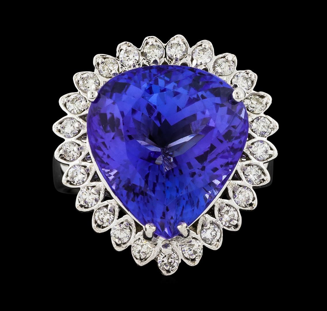 One electronically tested 14KT white gold lady's cast fashion ring with a scalloped basket halo with a bright polish finish. The featured lady's ring has a shank measuring 2.29 millimeters wide. Identified with markings of 'K14'. Condition is new, good workmanship. Containing: One prong set pear modified brilliant cut natural tanzanite, measuring 14.91 x 13.45 x 9.78mm, (depth est.) 3%. bulge factor, approximate weight of 13.48ct., clarity is eye clean, medium, moderately strong, violet color, (GIA V 5/4), cut is very good. Transmitting light with no distortion, transparent. Colored gemstones are presumed to have been subjected to commonly used enhancement processes. Graded loose prior to setting in the GIA Laboratory, Report #6177847835. Twenty-Five prong set round brilliant cut diamonds, measuring 1.80 - 1.75 x 1.10mm (depth est.) approximate total weight of 25 Stones = 0.55ct. Graded in the setting. Clarity SI-1 to SI-2. Color: H - I Cut Good. Total Weight of Colored Stones 13.48ct.. Total Weight of Diamonds 0.55ct.. Total Weight of Ring 9.90gm. GAS Appraised at $20,435.00.