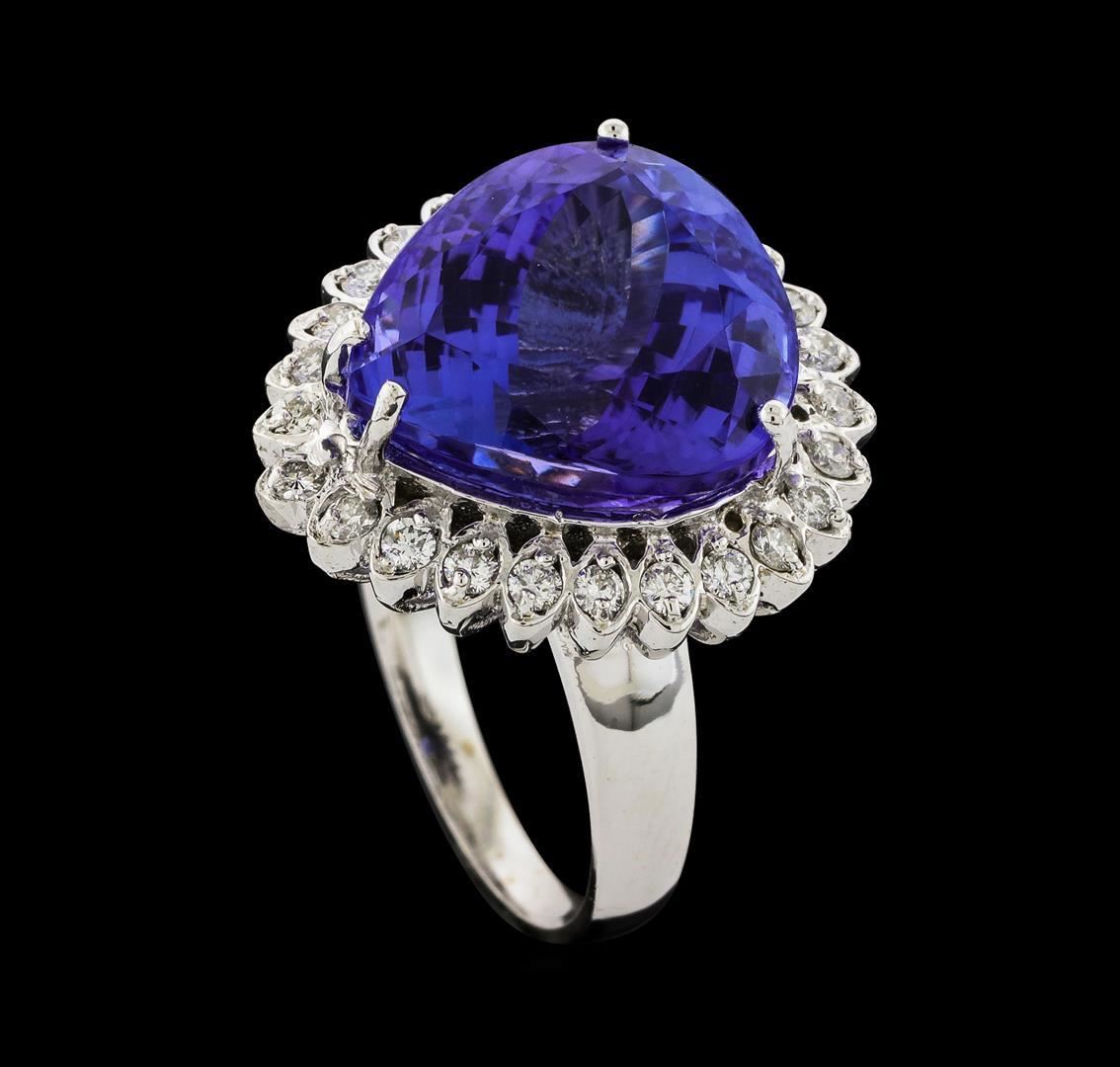 One electronically tested 14KT white gold lady's cast fashion ring with a scalloped basket halo with a bright polish finish. The featured lady's ring has a shank measuring 2.29 millimeters wide. Identified with markings of 'K14'. Condition is new, good workmanship. Containing: One prong set pear modified brilliant cut natural tanzanite, measuring 14.91 x 13.45 x 9.78mm, (depth est.) 3%. bulge factor, approximate weight of 13.48ct., clarity is eye clean, medium, moderately strong, violet color, (GIA V 5/4), cut is very good. Transmitting light with no distortion, transparent. Colored gemstones are presumed to have been subjected to commonly used enhancement processes. Graded loose prior to setting in the GIA Laboratory, Report #6177847835. Twenty-Five prong set round brilliant cut diamonds, measuring 1.80 - 1.75 x 1.10mm (depth est.) approximate total weight of 25 Stones = 0.55ct. Graded in the setting. Clarity SI-1 to SI-2. Color: H - I Cut Good. Total Weight of Colored Stones 13.48ct.. Total Weight of Diamonds 0.55ct.. Total Weight of Ring 9.90gm. GAS Appraised.