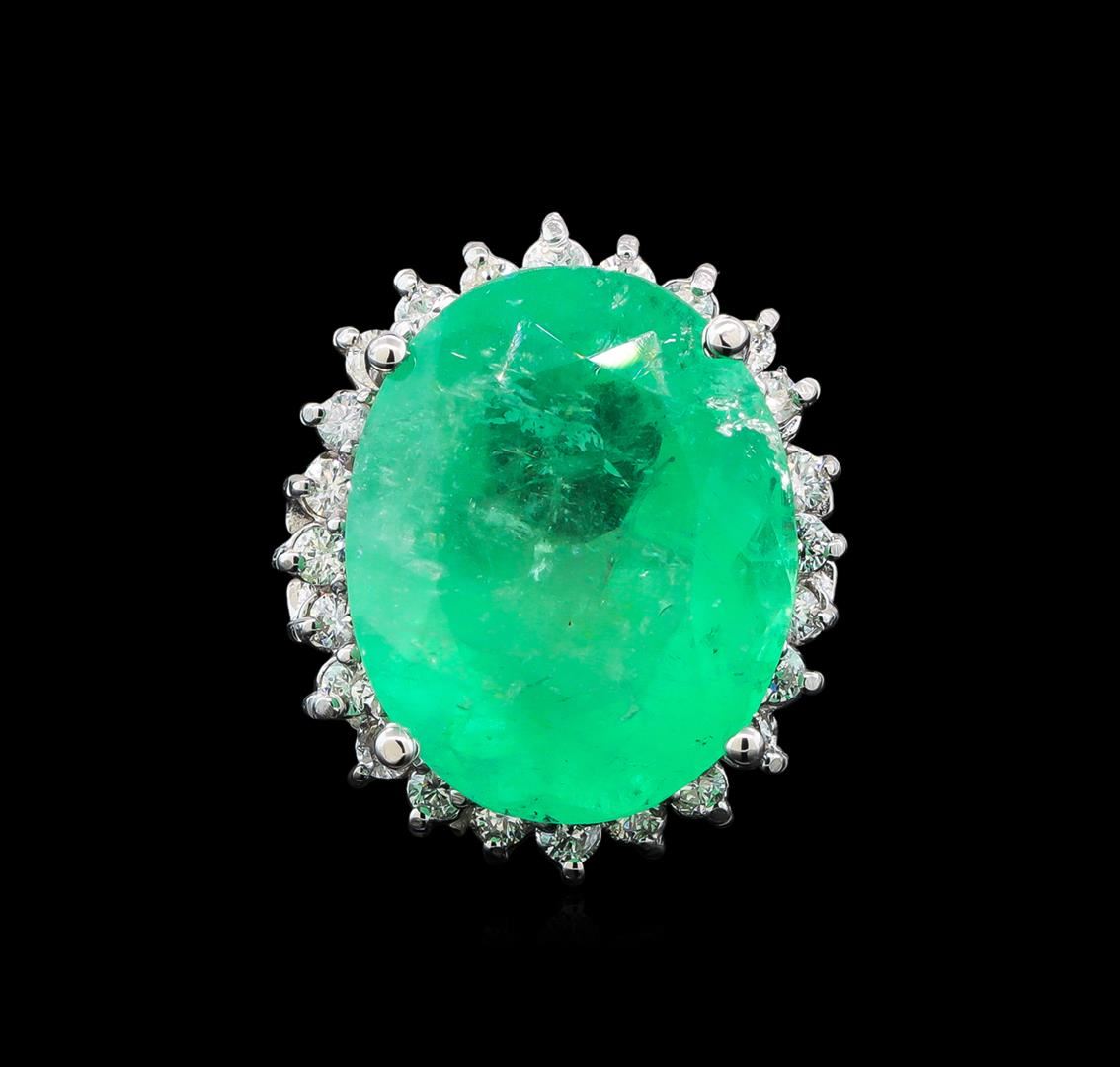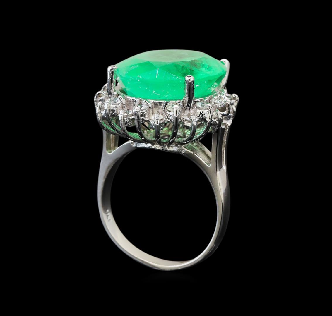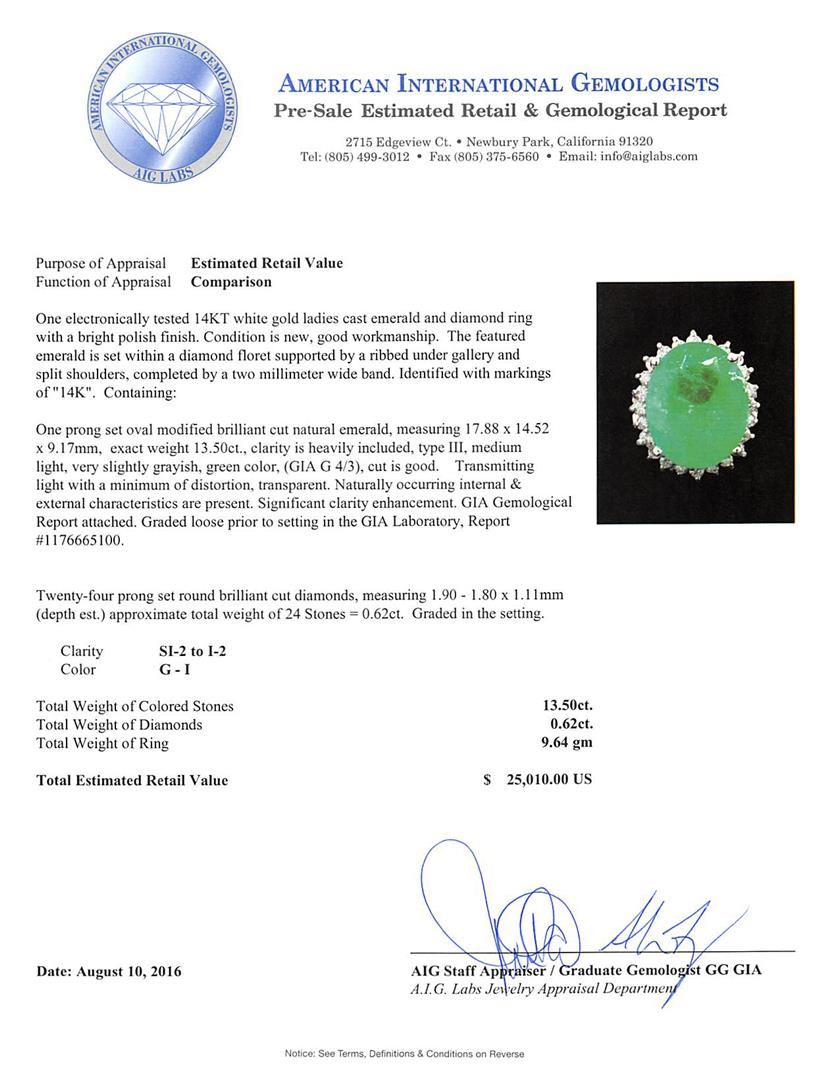 One electronically tested 14KT white gold ladies cast emerald and diamond ring with a bright polish finish. The featured emerald is set within a diamond floret supported by a ribbed under gallery and split shoulders, completed by a two millimeter wide band. Identified with markings of '14K'. Condition is new, good workmanship. Containing: One prong set oval modified brilliant cut natural emerald, measuring 17.88 x 14.52 x 9.17mm, exact weight 13.50ct., clarity is heavily included, type III, medium light, very slightly grayish, green color, (GIA G 4/3), cut is good. Transmitting light with a minimum of distortion, transparent. Naturally occurring internal & external characteristics are present. Significant clarity enhancement. GIA Gemological Report attached. Graded loose prior to setting in the GIA Laboratory, Report #1176665100. Twenty-Four prong set round brilliant cut diamonds, measuring 1.90 - 1.80 x 1.11mm (depth est.) approximate total weight of 24 Stones = 0.62ct. Graded in the setting. Clarity SI-2 to I-2. Color: G - I. Total Weight of Colored Stones 13.50ct.. Total Weight of Diamonds 0.62ct.. Total Weight of Ring 9.64gm. AIG Appraised at $25,010.00.