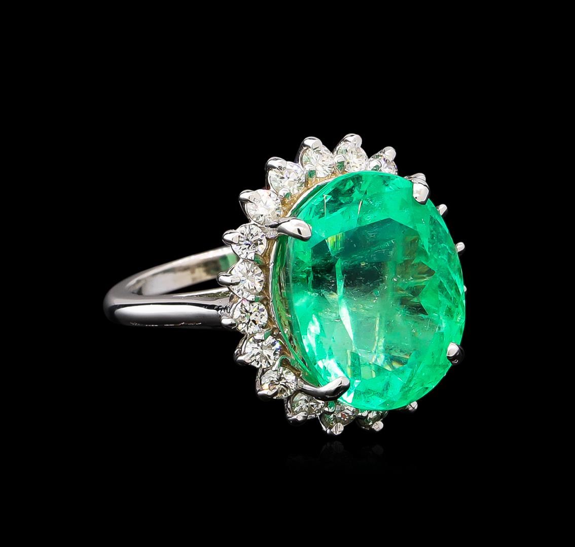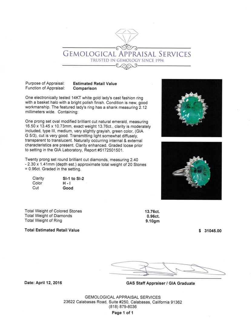 One electronically tested 14KT white gold lady's cast fashion ring with a basket halo with a bright polish finish. The featured lady's ring has a shank measuring 2.12 millimeters wide. Condition is new, good workmanship. Containing: One prong set oval modified brilliant cut natural emerald, measuring 16.50 x 13.45 x 10.73mm, exact weight 13.76ct., clarity is moderately included, type III, medium, very slightly grayish, green color, (GIA G 5/3), cut is very good. Transmitting light somewhat diffusely, transparent to translucent. Naturally occurring internal & external characteristics are present. Clarity enhanced. Graded loose prior to setting in the GIA Laboratory, Report #5172501501.Twenty prong set round brilliant cut diamonds, measuring 2.40 - 2.30 x 1.41mm (depth est.) approximate total weight of 20 Stones = 0.96ct. Graded in the setting. Clarity: SI-1 to SI-2. Color: H - I. Cut Good. Total Weight of Colored Stones 13.76ct. Total Weight of Diamonds 0.96ct. Total Weight of Ring 9.10gm. GAS Appraised at $31,045.00.