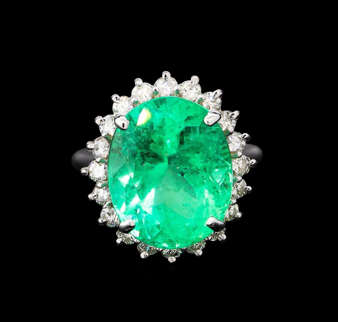 One electronically tested 14KT white gold lady's cast fashion ring with a basket halo with a bright polish finish. The featured lady's ring has a shank measuring 2.12 millimeters wide. Condition is new, good workmanship. Containing: One prong set oval modified brilliant cut natural emerald, measuring 16.50 x 13.45 x 10.73mm, exact weight 13.76ct., clarity is moderately included, type III, medium, very slightly grayish, green color, (GIA G 5/3), cut is very good. Transmitting light somewhat diffusely, transparent to translucent. Naturally occurring internal & external characteristics are present. Clarity enhanced. Graded loose prior to setting in the GIA Laboratory, Report #5172501501.Twenty prong set round brilliant cut diamonds, measuring 2.40 - 2.30 x 1.41mm (depth est.) approximate total weight of 20 Stones = 0.96ct. Graded in the setting. Clarity: SI-1 to SI-2. Color: H - I. Cut Good. Total Weight of Colored Stones 13.76ct. Total Weight of Diamonds 0.96ct. Total Weight of Ring 9.10gm. GAS Appraised at $31,045.00.