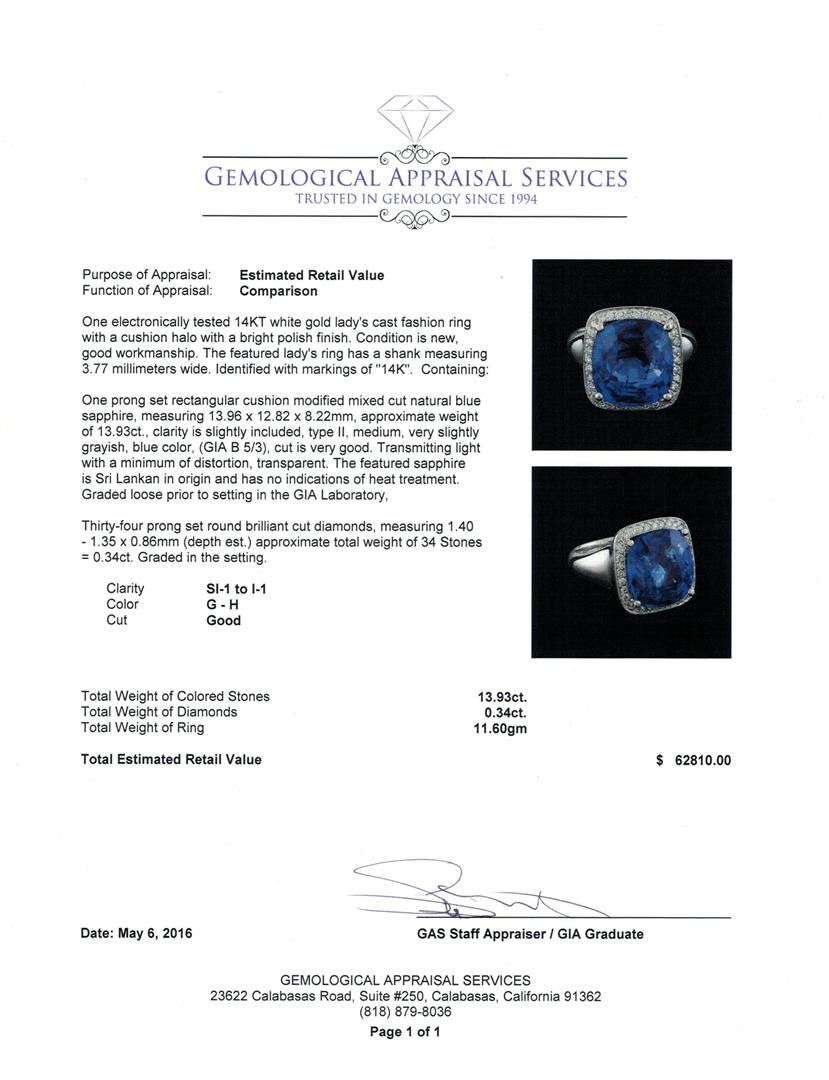 One electronically tested 14KT white gold lady's cast fashion ring with a cushion halo with a bright polish finish. The featured lady's ring has a shank measuring 3.77 millimeters wide. Identified with markings of "14K". Condition is new, good workmanship. Containing: One prong set rectangular cushion modified mixed cut natural blue sapphire, measuring 13.96 x 12.82 x 8.22mm, approximate weight of 13.93ct., clarity is slightly included, type II, medium, very slightly grayish, blue color, (GIA B 5/3), cut is very good. Transmitting light with a minimum of distortion, transparent. The featured sapphire is Sri Lankan in origin and has no indications of heat treatment. Graded loose prior to setting in the GIA Laboratory, Report #2175501552.Thirty-Four prong set round brilliant cut diamonds, measuring 1.40 - 1.35 x 0.86mm (depth est.) approximate total weight of 34 Stones = 0.34ct. Graded in the setting. Clarity: SI-1 to I-1. Color: G - Good. Total Weight of Colored Stones 13.93ct. Total Weight of Diamonds 0.34ct. Total Weight of Ring 11.60gm GAS Appraised at $62,810.00.