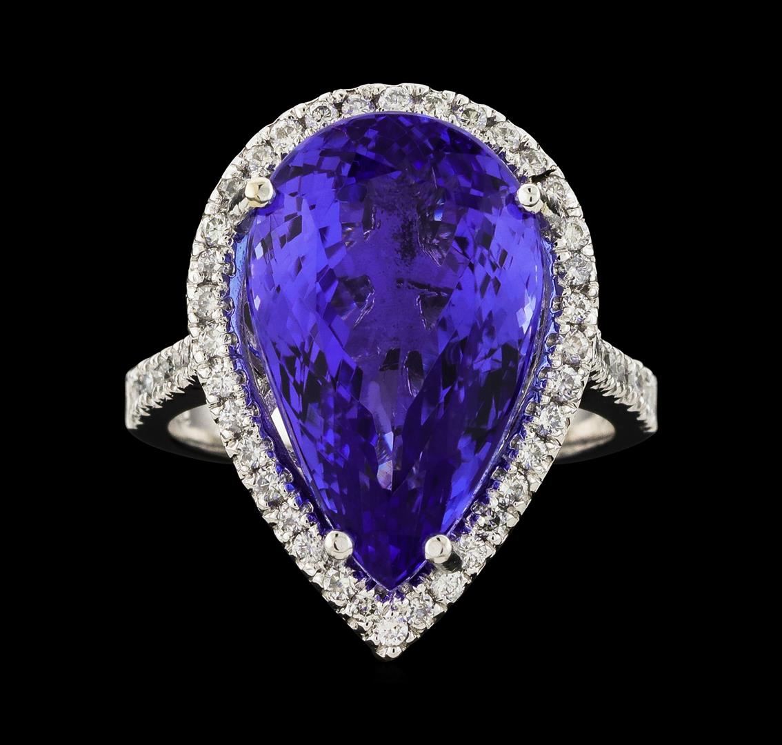 One electronically tested 14KT white gold lady's cast fashion ring with a cathedral shank with a basket halo with a bright polish finish. The featured lady's ring has a shank measuring 2.49 millimeters wide. Identified with markings of 'K14'. Condition is new, good workmanship. Containing: One prong set pear modified brilliant cut natural tanzanite, measuring 18.37 x 11.33 x 8.98mm, (depth est.) 14%. bulge factor, approximate weight of 14.31ct., clarity is eye clean, medium dark, moderately strong, bluish violet color, (GIA bV 6/4), cut is very good. Transmitting light with no distortion, transparent. Colored gemstones are presumed to have been subjected to commonly used enhancement processes. Graded loose prior to setting in the GIA Laboratory, Report #2175847826. Sixteen prong set round brilliant cut diamonds, measuring 1.70 - 1.50 x 0.96mm (depth est.) approximate total weight of 16 Stones = 0.24ct. Graded in the setting. Clarity SI-1 to I-1. Color: G - H Cut Good Thirty-Six prong set round brilliant cut diamonds, measuring 1.40 - 1.30 x 0.82mm (depth est.) approximate total weight of 36 Stones = 0.33ct. Graded in the setting. Clarity SI-1 to SI-3. Color: G - I Cut Good. Total Weight of Colored Stones 14.31ct.. Total Weight of Diamonds 0.57ct.. Total Weight of Ring 8.60gm. GAS Appraised at $23,770.00.