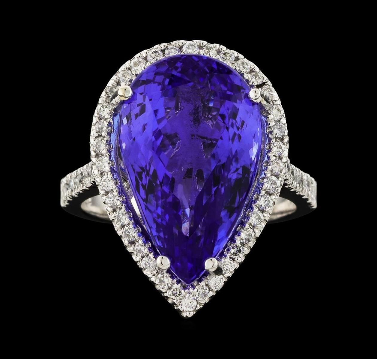 One electronically tested 14KT white gold lady's cast fashion ring with a cathedral shank with a basket halo with a bright polish finish. The featured lady's ring has a shank measuring 2.49 millimeters wide. Identified with markings of 'K14'. Condition is new, good workmanship. Containing: One prong set pear modified brilliant cut natural tanzanite, measuring 18.37 x 11.33 x 8.98mm, (depth est.) 14%. bulge factor, approximate weight of 14.31ct., clarity is eye clean, medium dark, moderately strong, bluish violet color, (GIA bV 6/4), cut is very good. Transmitting light with no distortion, transparent. Colored gemstones are presumed to have been subjected to commonly used enhancement processes. Graded loose prior to setting in the GIA Laboratory, Report #2175847826. Sixteen prong set round brilliant cut diamonds, measuring 1.70 - 1.50 x 0.96mm (depth est.) approximate total weight of 16 Stones = 0.24ct. Graded in the setting. Clarity SI-1 to I-1. Color: G - H Cut Good Thirty-Six prong set round brilliant cut diamonds, measuring 1.40 - 1.30 x 0.82mm (depth est.) approximate total weight of 36 Stones = 0.33ct. Graded in the setting. Clarity SI-1 to SI-3. Color: G - I Cut Good. Total Weight of Colored Stones 14.31ct.. Total Weight of Diamonds 0.57ct.. Total Weight of Ring 8.60gm. GAS Appraised.
