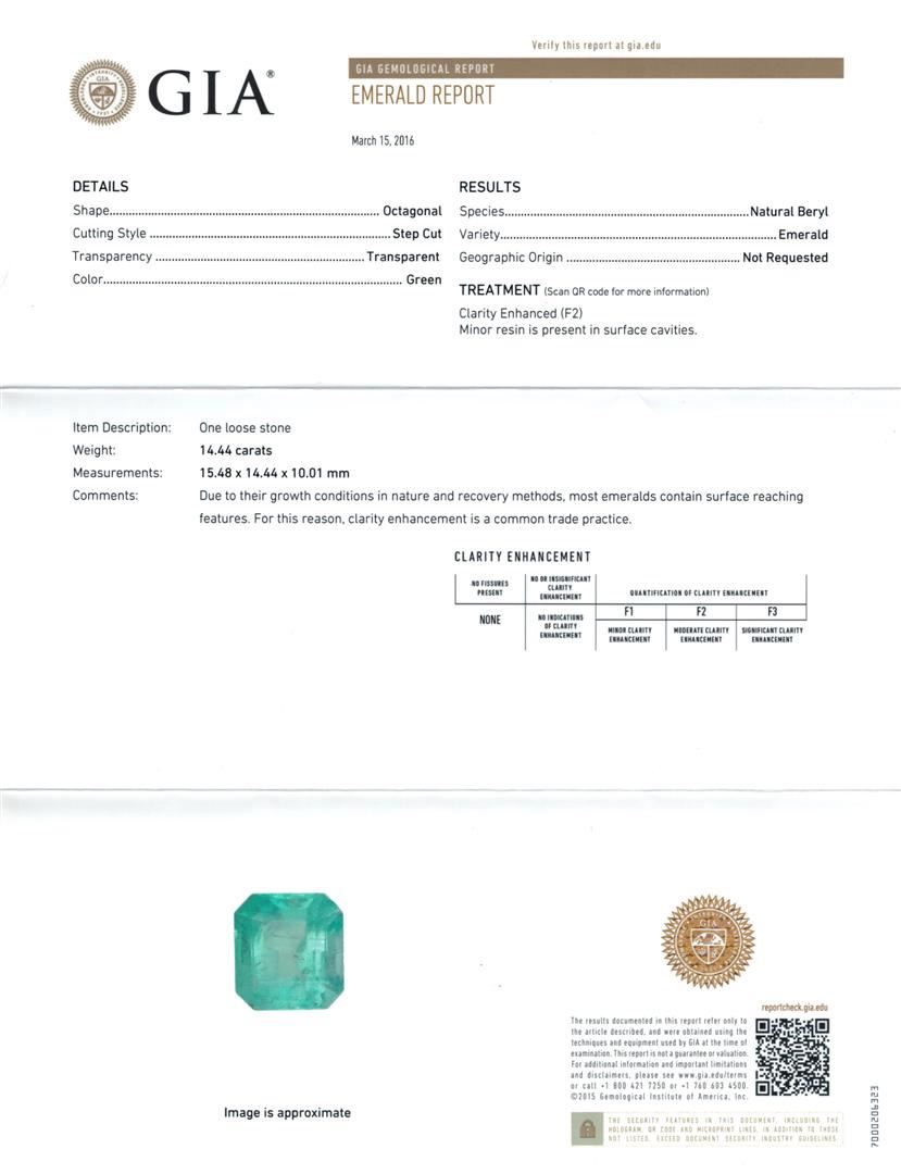 One electronically tested 14KT yellow gold lady's cast fashion ring with a double basket halo with a bright polish finish. The featured lady's ring has a shank measuring 2.30 millimeters wide. Identified with markings of "K14". Condition is new, good workmanship. Containing: One prong set emerald step cut natural emerald, measuring 15.48 x 14.44 x 10.01mm, exact weight 14.44ct., clarity is moderately included, type III, medium light, very slightly grayish, green color, (GIA G 4/3), cut is good. Transmitting light somewhat diffusely, transparent to translucent. Naturally occurring internal & external characteristics are present. Clarity enhanced. Graded loose prior to setting in the GIA Laboratory, Report #2171501558.Thirty-Two prong set round brilliant cut diamonds, measuring 2.20 - 2.10 x 1.33mm (depth est.) approximate total weight of 32 Stones = 1.23ct. Graded in the setting. Clarity: SI-1 to SI-2. Color: H - I. Cut Good. Total Weight of Colored Stones 14.44ct. Total Weight of Diamonds 1.23ct. Total Weight of Ring 9.60gm. GAS Appraised at $11,980.00.