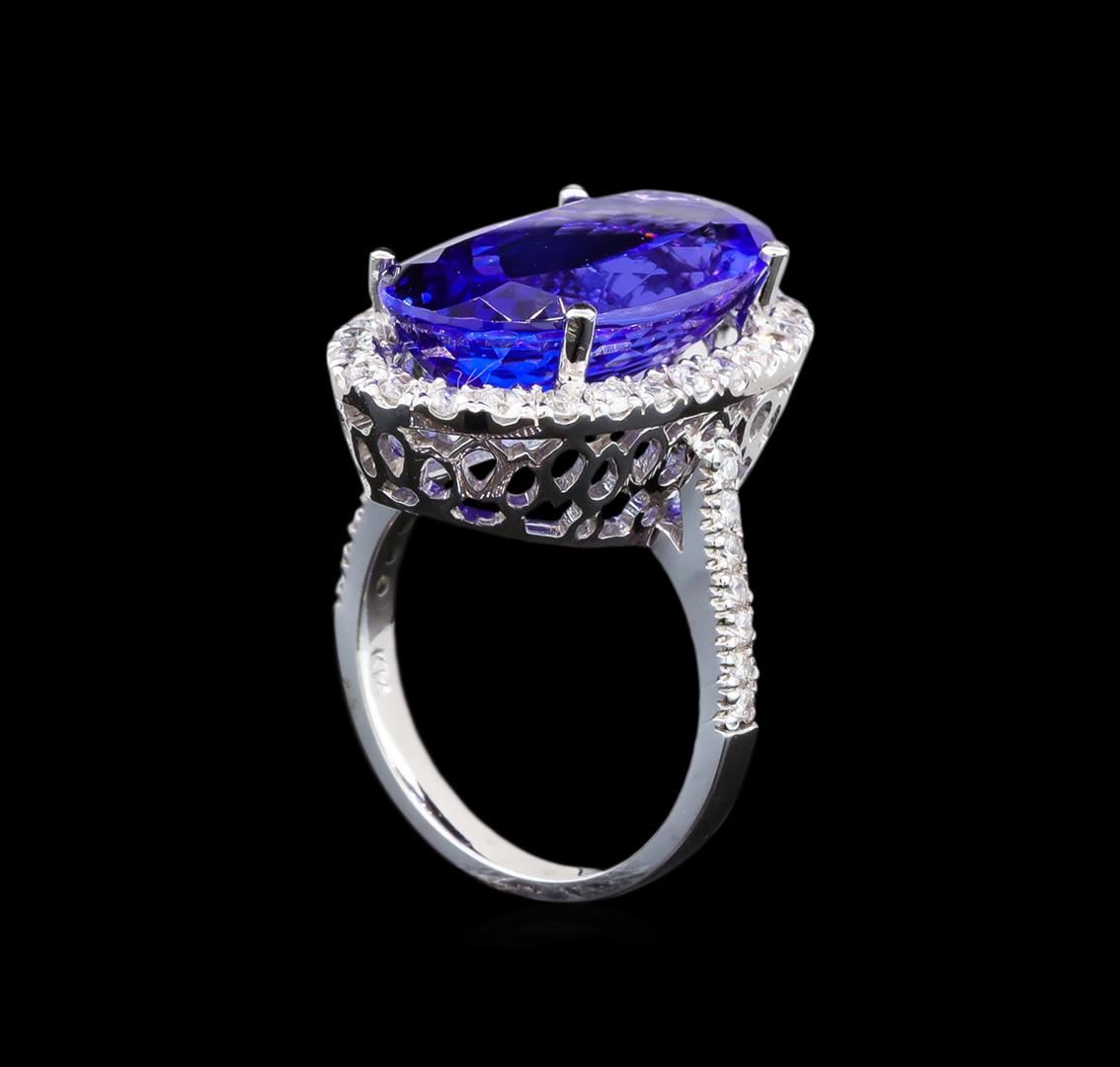 One electronically tested 14KT white gold lady's cast fashion ring with a halo with a bright polish finish. The featured lady's ring has a shank measuring 2.46 millimeters wide. Identified with markings of 'K14'. Condition is new, good workmanship. Containing: One prong set oval modified brilliant cut natural tanzanite, measuring 21.00 x 11.67 x 7.66mm, (depth est.) 10%. bulge factor, approximate weight of 14.53ct., clarity is eye clean, medium dark, strong, bluish violet color, (GIA bV 6/5), cut is very good. Transmitting light with no distortion, transparent. Colored gemstones are presumed to have been subjected to commonly used enhancement processes. Graded loose prior to setting in the GIA Laboratory, Report #5172668761. Forty prong set round brilliant cut diamonds, measuring 1.90 - 1.85 x 1.17mm (depth est.) approximate total weight of 40 Stones = 1.00ct. Graded in the setting. Clarity SI-1 to SI-2. Color: H - I Cut Good. Total Weight of Colored Stones 14.53ct.. Total Weight of Diamonds 1.00ct.. Total Weight of Ring 9.60gm. GAS Appraised at $25,980.00.