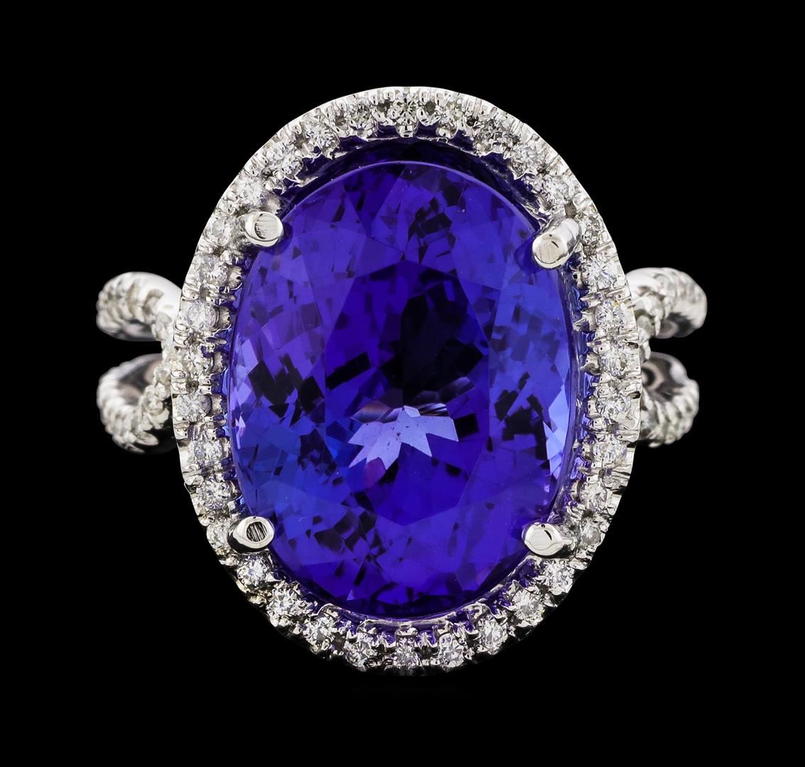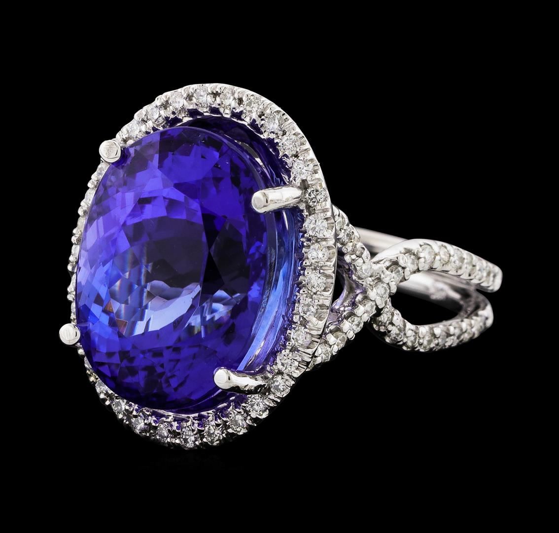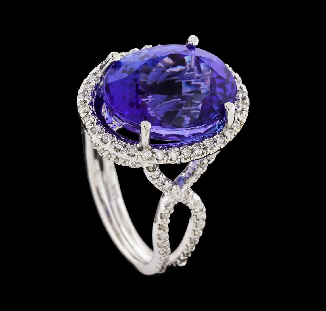 One electronically tested 14KT white gold lady's cast fashion ring with a overlapping split shank with a bright polish finish. The featured lady's ring has a double shank measuring 3.29 millimeters wide. Identified with markings of '14K'. Condition is new, good workmanship. Containing: One prong set oval modified brilliant cut natural tanzanite, measuring 15.79 x 12.04 x 10.24mm, (depth est.) 7%. bulge factor, approximate weight of 14.65ct., clarity is eye clean, medium, moderately strong, violetish blue color, (GIA vB 5/4), cut is excellent. Transmitting light with no distortion, transparent. Colored gemstones are presumed to have been subjected to commonly used enhancement processes. Graded loose prior to setting in the GIA Laboratory, Report #2171847721. One Hundred Twenty-Eight prong set round brilliant cut diamonds, measuring 1.20 - 1.10 x 0.71mm (depth est.) approximate total weight of 128 Stones = 0.73ct. Graded in the setting. Clarity SI-1 to I-1. Color: G - H Cut Good. Total Weight of Colored Stones 14.65ct.. Total Weight of Diamonds 0.73ct.. Total Weight of Ring 10.40gm. GAS Appraised at $25,150.00.