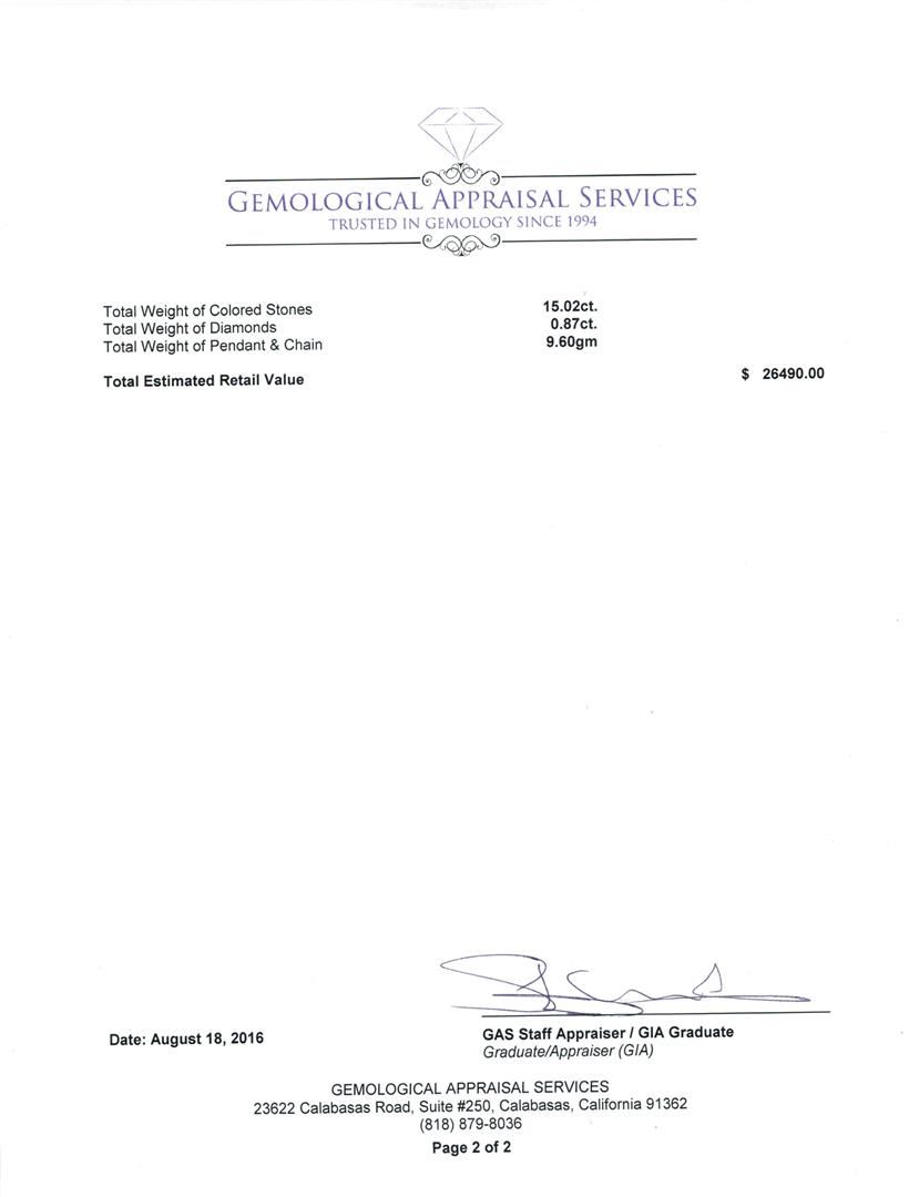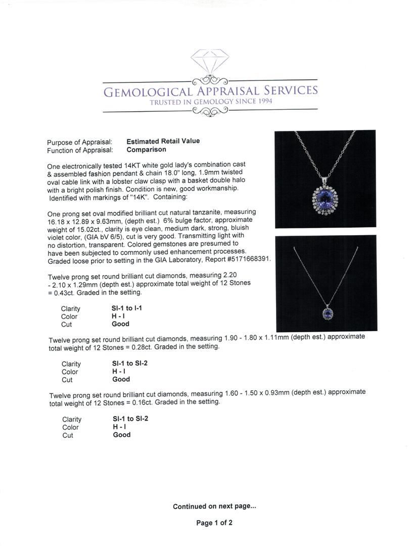 One electronically tested 14KT white gold lady's combination cast & assembled fashion pendant & chain 18.0' long, 1.9mm twisted oval cable link with a lobster claw clasp with a basket double halo with a bright polish finish. Identified with markings of '14K'. Condition is new, good workmanship. Containing: One prong set oval modified brilliant cut natural tanzanite, measuring 16.18 x 12.89 x 9.63mm, (depth est.) 6%. bulge factor, approximate weight of 15.02ct., clarity is eye clean, medium dark, strong, bluish violet color, (GIA bV 6/5), cut is very good. Transmitting light with no distortion, transparent. Colored gemstones are presumed to have been subjected to commonly used enhancement processes. Graded loose prior to setting in the GIA Laboratory, Report #5171668391. Twelve prong set round brilliant cut diamonds, measuring 2.20 - 2.10 x 1.29mm (depth est.) approximate total weight of 12 Stones = 0.43ct. Graded in the setting. Clarity SI-1 to I-1. Color: H - I Cut Good Twelve prong set round brilliant cut diamonds, measuring 1.90 - 1.80 x 1.11mm (depth est.) approximate total weight of 12 Stones = 0.28ct. Graded in the setting. Clarity SI-1 to SI-2. Color: H - I Cut Good Twelve prong set round brilliant cut diamonds, measuring 1.60 - 1.50 x 0.93mm (depth est.) approximate total weight of 12 Stones = 0.16ct. Graded in the setting. Clarity SI-1 to SI-2. Color: H - I Cut Good. Total Weight of Colored Stones 15.02ct.. Total Weight of Diamonds 0.87ct.. Total Weight of Pendant & Chain 9.60gm. GAS Appraised at $26,490.00.