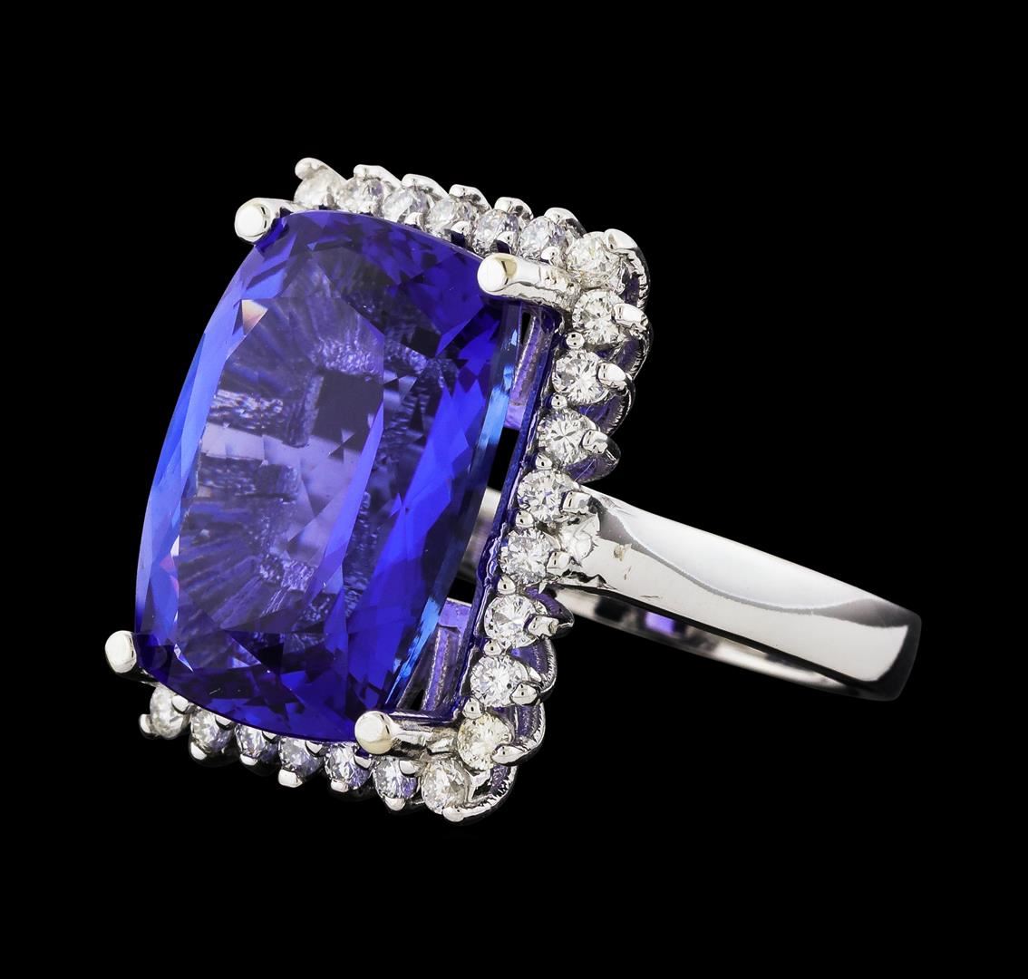 One electronically tested 14KT white gold lady's cast fashion ring with a basket halo with a bright polish finish. The featured lady's ring has a shank measuring 3.15 millimeters wide. Identified with markings of '14K'. Condition is new, good workmanship. Containing: One prong set rectangular cushion modified brilliant cut natural tanzanite, measuring 17.40 x 13.38 x 8.24mm, (depth est.) 5%. bulge factor, approximate total weight of 15.89ct., clarity is eye clean, medium dark, moderately strong, violetish blue color, (GIA vB 6/4), cut is very good. Transmitting light with no distortion, transparent. Colored gemstones are presumed to have been subjected to commonly used enhancement processes. Graded loose prior to setting in the GIA Laboratory, Report #1172847169. Thirty prong set round brilliant cut diamonds, measuring 1.95 - 1.85 x 1.18mm (depth est.) approximate total weight of 30 Stones = 0.79ct. Graded in the setting. Clarity SI-1 to SI-3. Color: H - I Cut Good. Total Weight of Colored Stones 15.89ct.. Total Weight of Diamonds 0.79ct.. Total Weight of Ring 11.50gm. GAS Appraised at $27,270.00.
