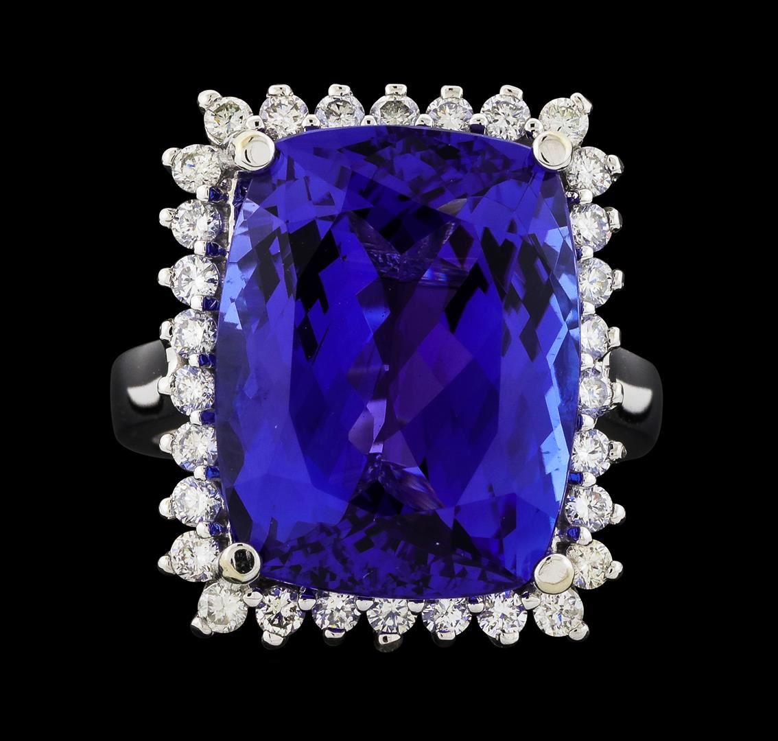 One electronically tested 14KT white gold lady's cast fashion ring with a basket halo with a bright polish finish. The featured lady's ring has a shank measuring 3.15 millimeters wide. Identified with markings of '14K'. Condition is new, good workmanship. Containing: One prong set rectangular cushion modified brilliant cut natural tanzanite, measuring 17.40 x 13.38 x 8.24mm, (depth est.) 5%. bulge factor, approximate total weight of 15.89ct., clarity is eye clean, medium dark, moderately strong, violetish blue color, (GIA vB 6/4), cut is very good. Transmitting light with no distortion, transparent. Colored gemstones are presumed to have been subjected to commonly used enhancement processes. Graded loose prior to setting in the GIA Laboratory, Report #1172847169. Thirty prong set round brilliant cut diamonds, measuring 1.95 - 1.85 x 1.18mm (depth est.) approximate total weight of 30 Stones = 0.79ct. Graded in the setting. Clarity SI-1 to SI-3. Color: H - I Cut Good. Total Weight of Colored Stones 15.89ct.. Total Weight of Diamonds 0.79ct.. Total Weight of Ring 11.50gm. GAS Appraised at $27,270.00.
