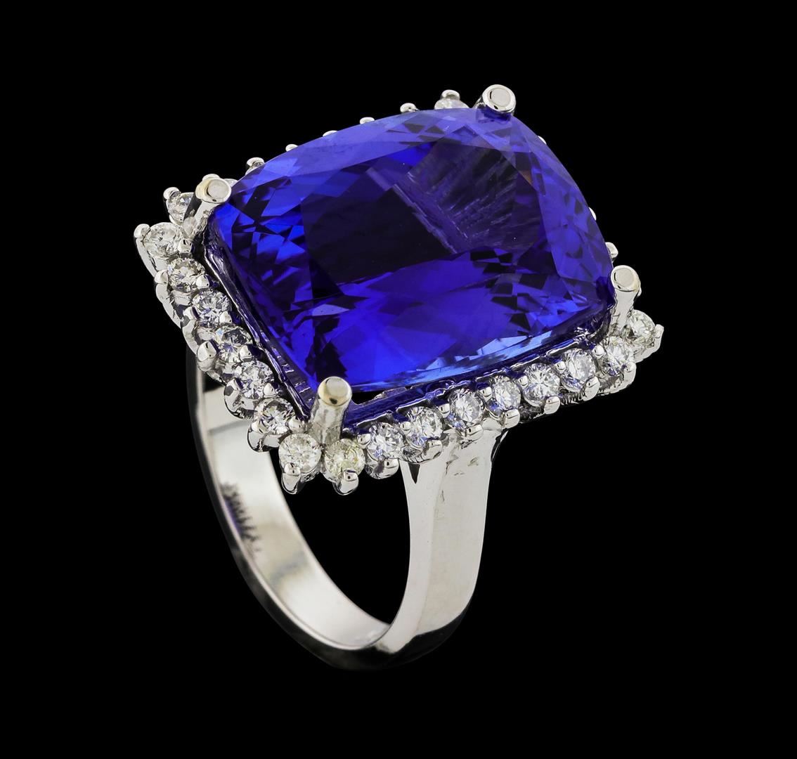 One electronically tested 14KT white gold lady's cast fashion ring with a basket halo with a bright polish finish. The featured lady's ring has a shank measuring 3.15 millimeters wide. Identified with markings of '14K'. Condition is new, good workmanship. Containing: One prong set rectangular cushion modified brilliant cut natural tanzanite, measuring 17.40 x 13.38 x 8.24mm, (depth est.) 5%. bulge factor, approximate total weight of 15.89ct., clarity is eye clean, medium dark, moderately strong, violetish blue color, (GIA vB 6/4), cut is very good. Transmitting light with no distortion, transparent. Colored gemstones are presumed to have been subjected to commonly used enhancement processes. Graded loose prior to setting in the GIA Laboratory, Report #1172847169. Thirty prong set round brilliant cut diamonds, measuring 1.95 - 1.85 x 1.18mm (depth est.) approximate total weight of 30 Stones = 0.79ct. Graded in the setting. Clarity SI-1 to SI-3. Color: H - I Cut Good. Total Weight of Colored Stones 15.89ct.. Total Weight of Diamonds 0.79ct.. Total Weight of Ring 11.50gm. GAS Appraised at $27,270.00.
