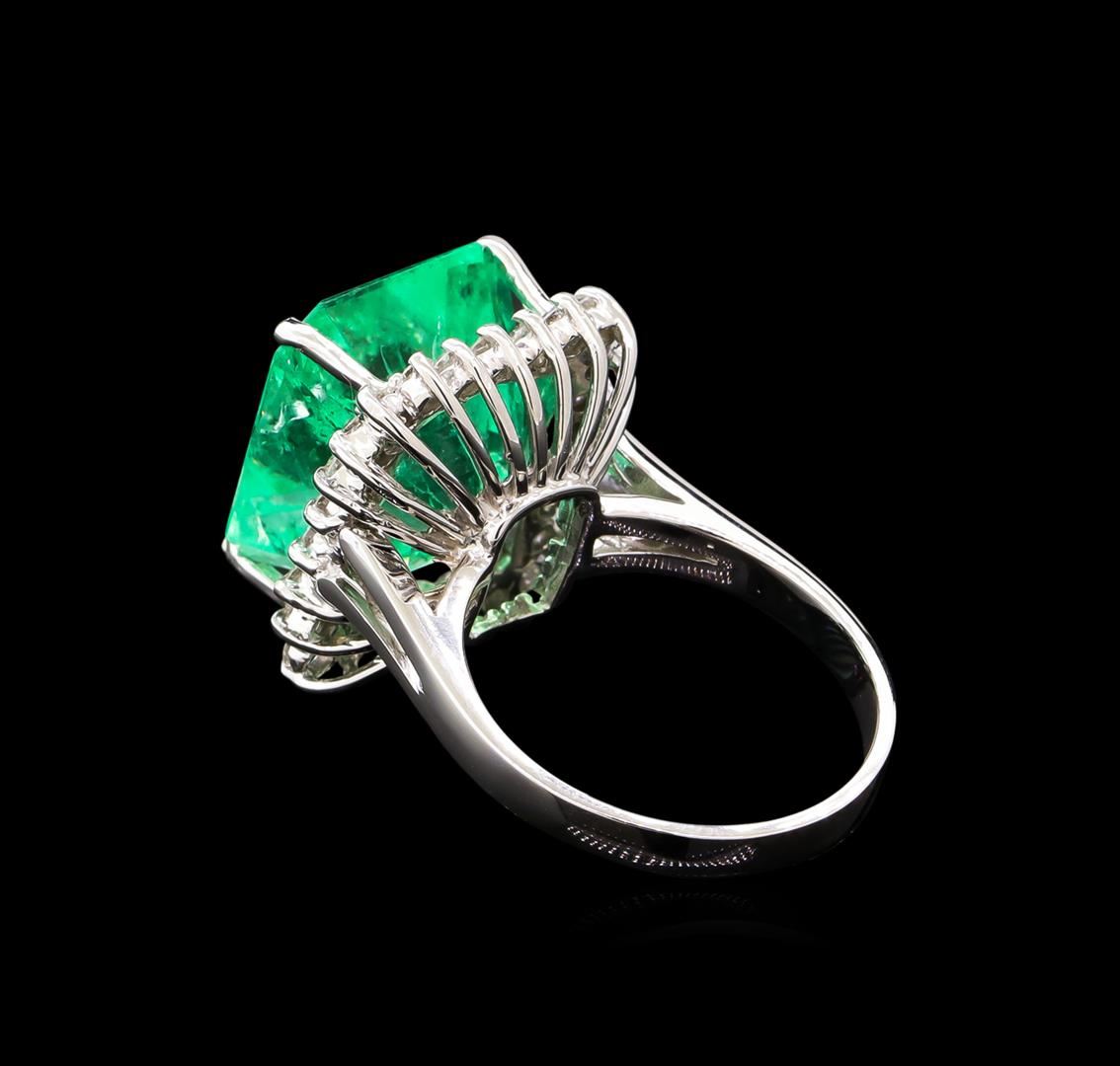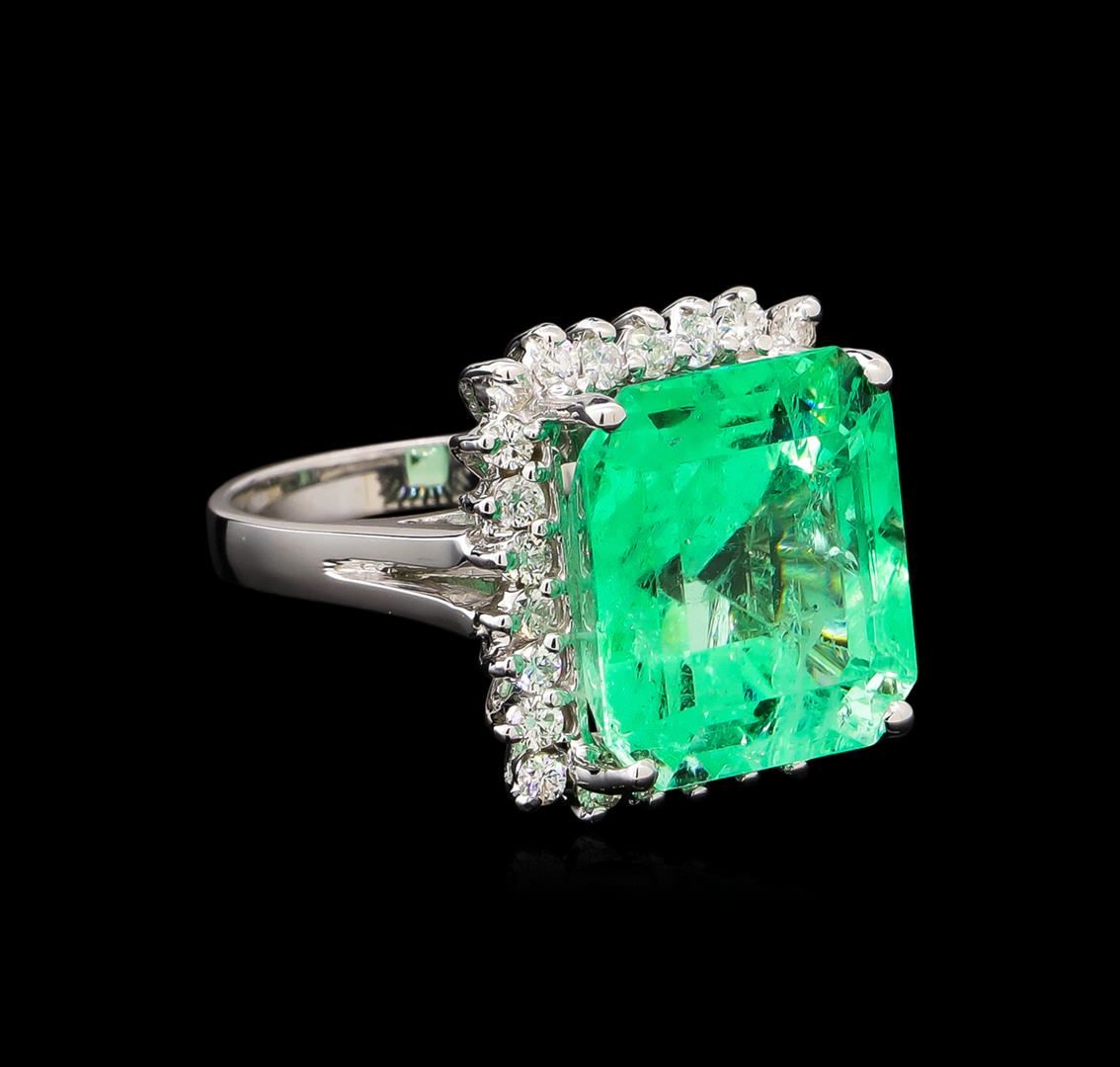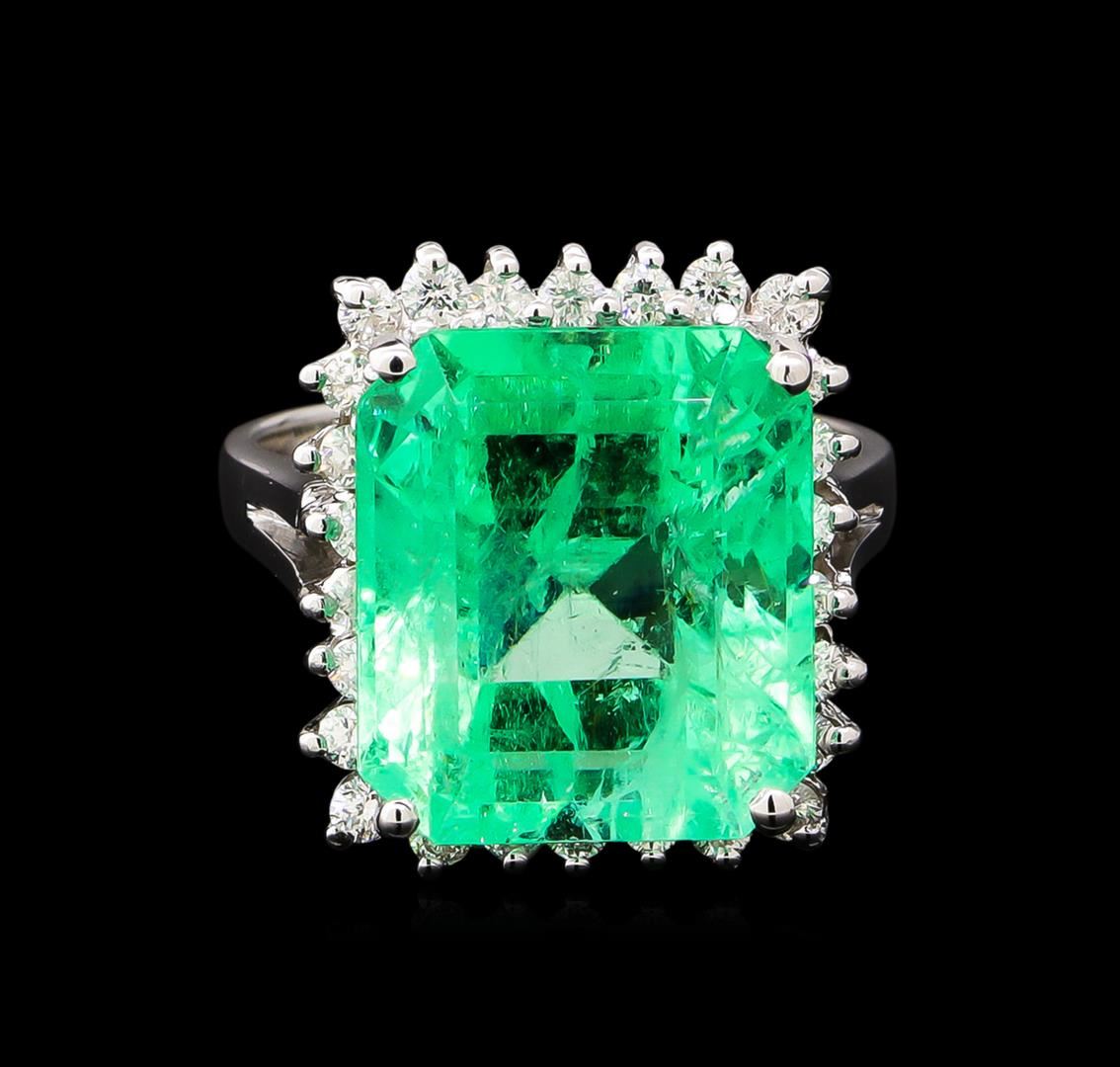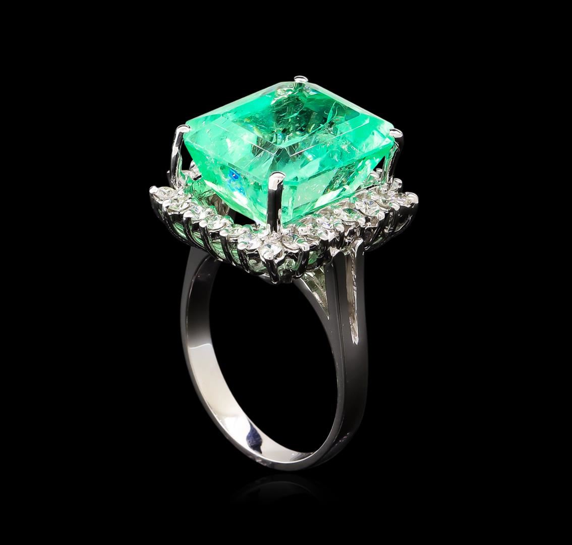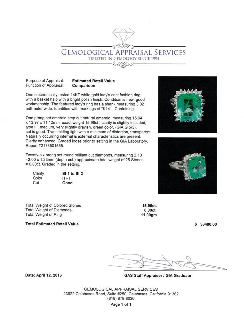 One electronically tested 14KT white gold lady's cast fashion ring with a basket halo with a bright polish finish. The featured lady's ring has a shank measuring 3.02 millimeter wide. Identified with markings of "K14". Condition is new, good workmanship. Containing: One prong set emerald step cut natural emerald, measuring 15.94 x 13.97 x 11.12mm, exact weight 15.96ct., clarity is slightly included, type III, medium, very slightly grayish, green color, (GIA G 5/3), cut is good. Transmitting light with a minimum of distortion, transparent. Naturally occurring internal & external characteristics are present. Clarity enhanced. Graded loose prior to setting in the GIA Laboratory, Report #2173501555.Twenty-Six prong set round brilliant cut diamonds, measuring 2.10 - 2.00 x 1.23mm (depth est.) approximate total weight of 26 Stones = 0.80ct. Graded in the setting. Clarity: SI-1 to SI-2. Color: H - I. Cut Good. Total Weight of Colored Stones 15.96ct. Total Weight of Diamonds 0.80ct. Total Weight of Ring 11.00gm. GAS Appraised at $36,480.00.