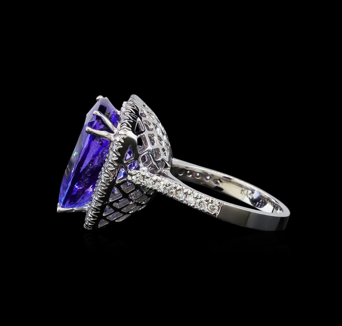 One electronically tested 14KT white gold lady's cast fashion ring with a cathedral shank with a basket halo with a bright polish finish. The featured lady's ring has a shank measuring 2.40 millimeters wide. Identified with markings of 'K14'. Condition is new, good workmanship. Containing: One prong set triangle modified brilliant cut natural tanzanite, measuring 17.31 x 18.01 x 9.52mm, (depth est.) approximate weight of 16.05ct., clarity is eye clean, medium, moderately strong, bluish violet color, (GIA bV 5/4), cut is very good. Transmitting light with no distortion, transparent. Colored gemstones are presumed to have been subjected to commonly used enhancement processes. Graded loose prior to setting in the GIA Laboratory, Report #2175668742. Fifty prong set round brilliant cut diamonds, measuring 1.60 - 1.50 x 0.96mm (depth est.) approximate total weight of 50 Stones = 0.70ct. Graded in the setting. Clarity SI-1 to I-1. Color: G - I Cut Good. Total Weight of Colored Stones 16.05ct.. Total Weight of Diamonds 0.70ct.. Total Weight of Ring 10.80gm. GAS Appraised at $29,565.00.