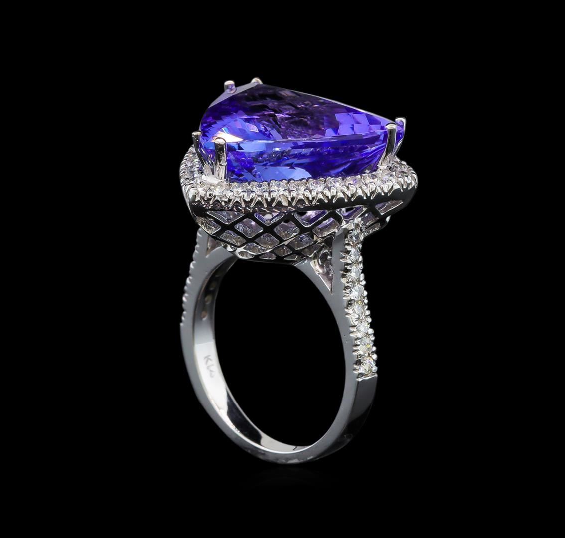 One electronically tested 14KT white gold lady's cast fashion ring with a cathedral shank with a basket halo with a bright polish finish. The featured lady's ring has a shank measuring 2.40 millimeters wide. Identified with markings of 'K14'. Condition is new, good workmanship. Containing: One prong set triangle modified brilliant cut natural tanzanite, measuring 17.31 x 18.01 x 9.52mm, (depth est.) approximate weight of 16.05ct., clarity is eye clean, medium, moderately strong, bluish violet color, (GIA bV 5/4), cut is very good. Transmitting light with no distortion, transparent. Colored gemstones are presumed to have been subjected to commonly used enhancement processes. Graded loose prior to setting in the GIA Laboratory, Report #2175668742. Fifty prong set round brilliant cut diamonds, measuring 1.60 - 1.50 x 0.96mm (depth est.) approximate total weight of 50 Stones = 0.70ct. Graded in the setting. Clarity SI-1 to I-1. Color: G - I Cut Good. Total Weight of Colored Stones 16.05ct.. Total Weight of Diamonds 0.70ct.. Total Weight of Ring 10.80gm. GAS Appraised at $29,565.00.
