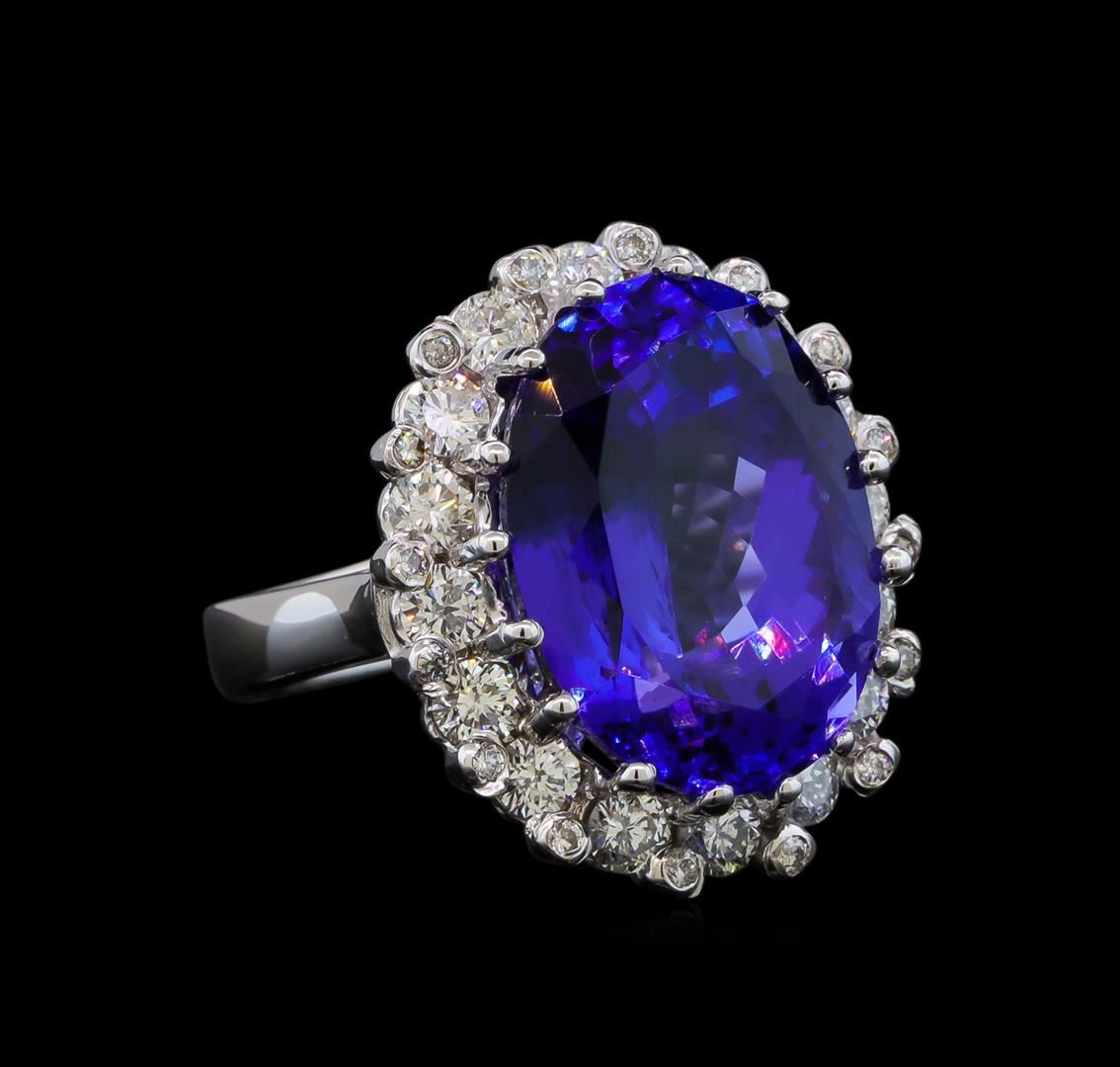 One electronically tested 14KT white gold lady's cast fashion ring with a double basket halo with a bright polish finish. The featured lady's ring has a shank measuring 4.03 millimeters wide. Identified with markings of '14K'. Condition is new, good workmanship. Containing: One prong set oval modified brilliant cut natural tanzanite, measuring 17.65 x 12.95 x 9.37mm, (depth est.) 6%. bulge factor, approximate weight of 16.07ct., clarity is eye clean, medium dark, strong, violet color, (GIA V 6/5), cut is very good. Transmitting light with no distortion, transparent. Colored gemstones are presumed to have been subjected to commonly used enhancement processes. Graded loose prior to setting in the GIA Laboratory, Report #1172668307. Sixteen prong set round brilliant cut diamonds, measuring 3.00 - 2.90 x 1.80mm (depth est.) approximate total weight of 16 Stones = 1.54ct. Graded in the setting. Clarity SI-1 to I-1. Color: G - I Cut Good Sixteen prong set round brilliant cut diamonds, measuring 1.40 - 1.35 x 0.86mm (depth est.) approximate total weight of 16 Stones = 0.16ct. Graded in the setting. Clarity SI-1 to SI-2. Color: H - I Cut Good. Total Weight of Colored Stones 16.07ct.. Total Weight of Diamonds 1.70ct.. Total Weight of Ring 11.90gm. GAS Appraised at $28,565.00.