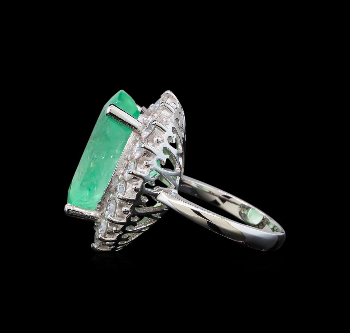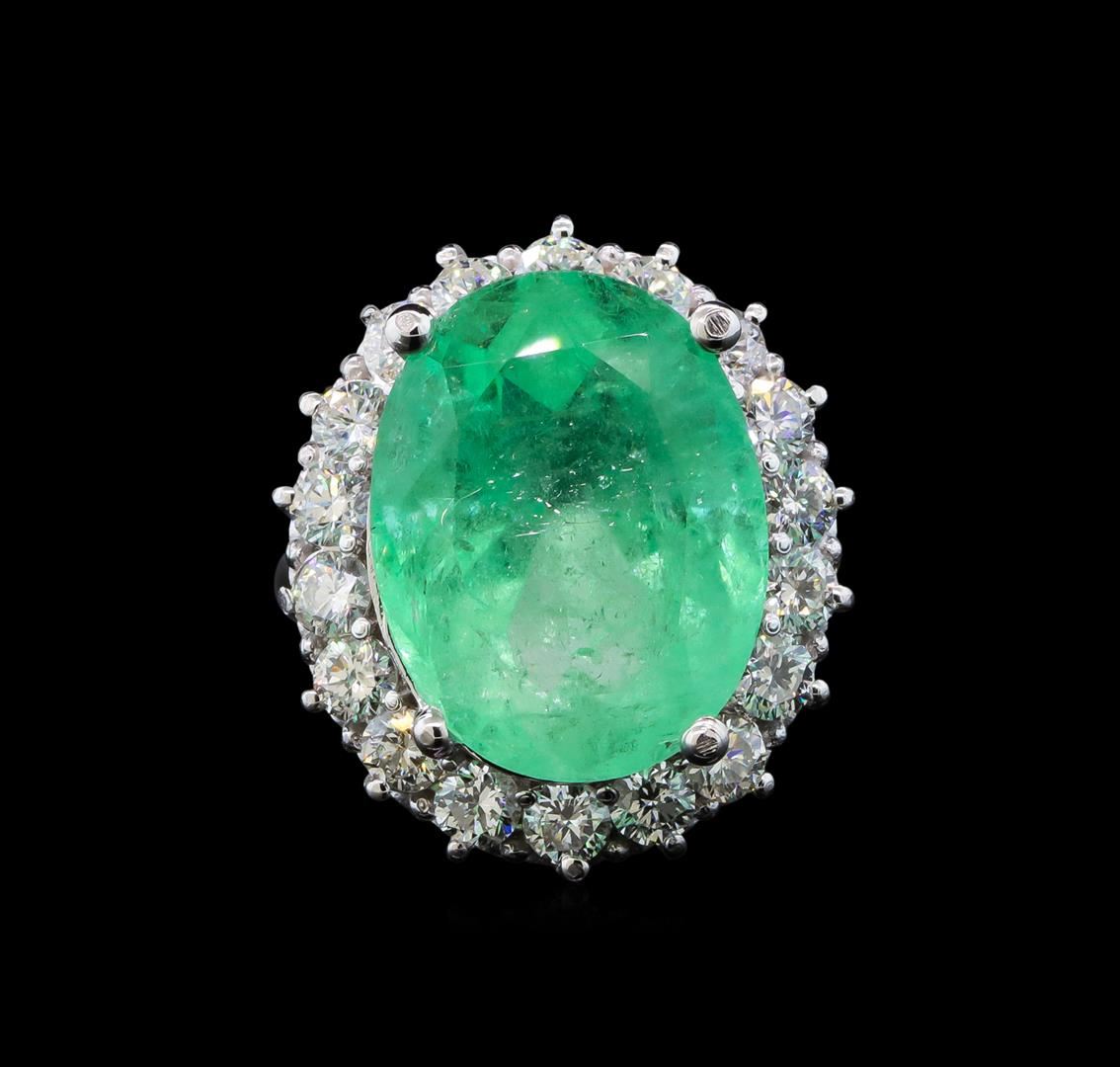One electronically tested 14KT white gold lady's cast fashion ring with a basket halo with a bright polish finish. The featured lady's ring has a shank measuring 2.93 millimeters wide. Identified with markings of 'K14'. Condition is new, good workmanship. Containing: One prong set oval modified brilliant cut natural emerald, measuring 18.86 x 14.53 x 11.01mm, (depth est.) approximate weight of 16.24ct., clarity is moderately included, medium light, moderately strong, green color, (GIA G 4/4), cut is good. Transmitting light somewhat diffusely, transparent to translucent. Naturally occurring internal & external characteristics are present. Indications of oil residue. Colored gemstones are presumed to have been subjected to commonly used enhancement processes. Graded loose prior to setting in the GIA Laboratory, Report #5172665459. Eighteen prong set round brilliant cut diamonds, measuring 3.30 - 3.20 x 2.02mm (depth est.) approximate total weight of 18 Stones = 2.34ct. Graded in the setting. Clarity SI-1 to I-1. Color: H - I Cut Very Good. Total Weight of Colored Stones 16.24ct.. Total Weight of Diamonds 2.34ct.. Total Weight of Ring 11.70gm. GAS Appraised at $27,540.00.