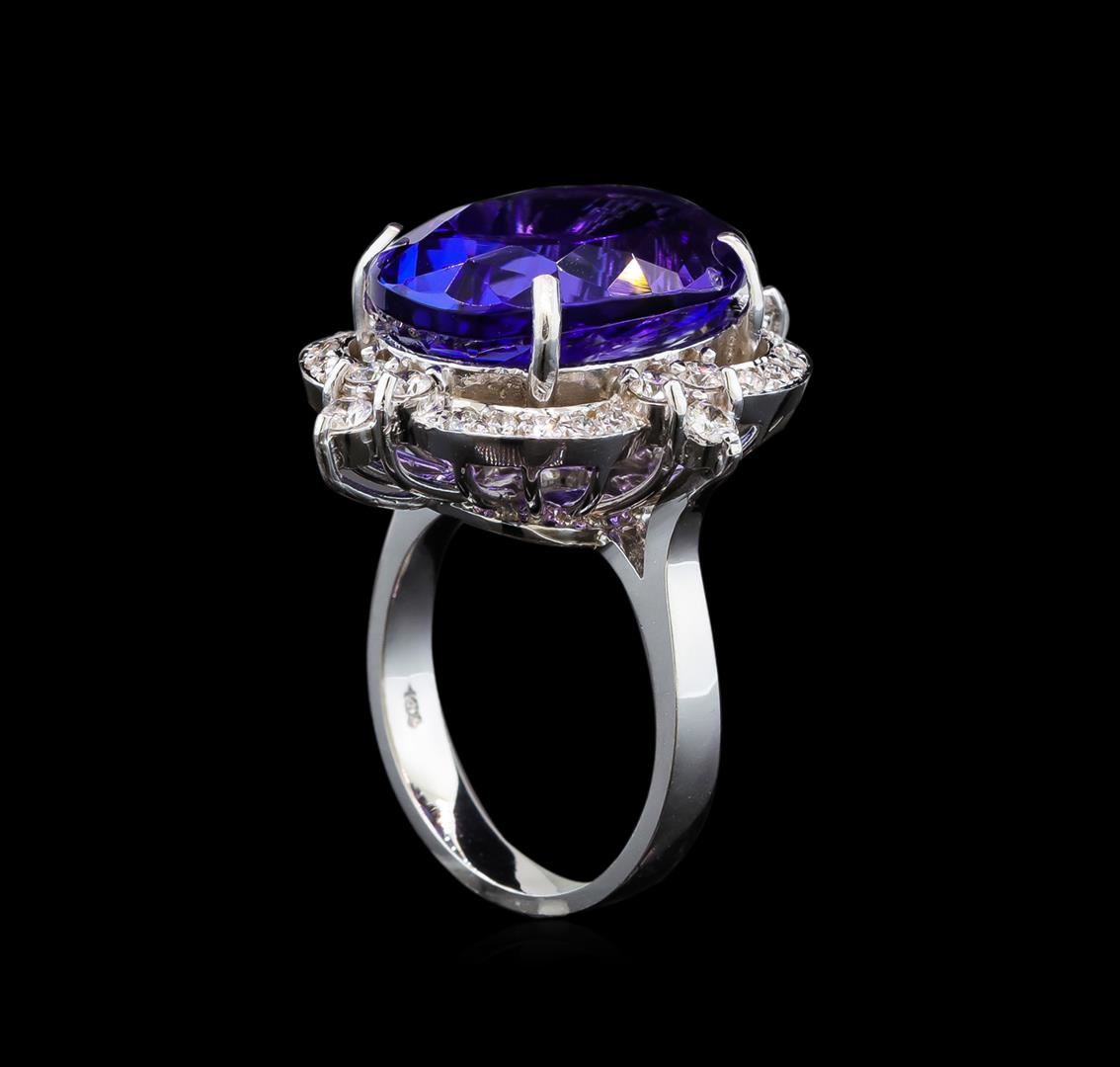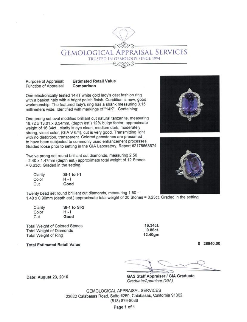 One electronically tested 14KT white gold lady's cast fashion ring with a basket halo with a bright polish finish. The featured lady's ring has a shank measuring 3.15 millimeters wide. Identified with markings of '14K'. Condition is new, good workmanship. Containing: One prong set oval modified brilliant cut natural tanzanite, measuring 18.72 x 13.01 x 8.54mm, (depth est.) 12%. bulge factor, approximate weight of 16.34ct., clarity is eye clean, medium dark, moderately strong, violet color, (GIA V 6/4), cut is very good. Transmitting light with no distortion, transparent. Colored gemstones are presumed to have been subjected to commonly used enhancement processes. Graded loose prior to setting in the GIA Laboratory, Report #2175668674. Twelve prong set round brilliant cut diamonds, measuring 2.50 - 2.40 x 1.47mm (depth est.) approximate total weight of 12 Stones = 0.63ct. Graded in the setting. Clarity SI-1 to I-1. Color: H - I Cut Good Twenty bead set round brilliant cut diamonds, measuring 1.50 - 1.40 x 0.90mm (depth est.) approximate total weight of 20 Stones = 0.23ct. Graded in the setting. Clarity SI-1 to SI-2. Color: H - I Cut Good. Total Weight of Colored Stones 16.34ct.. Total Weight of Diamonds 0.86ct.. Total Weight of Ring 12.40gm. GAS Appraised at $26,940.00.