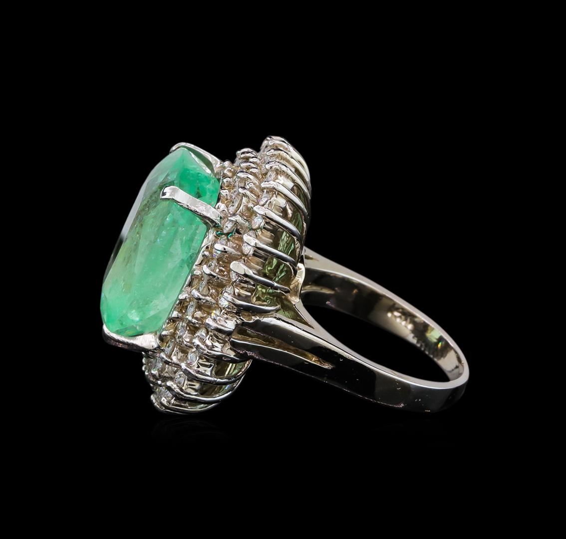 One electronically tested 14KT white gold lady's cast fashion ring with a double basket halo with a bright polish finish. The featured lady's ring has a shank measuring 2.29 millimeters wide. Identified with markings of '14K'. Condition is new, good workmanship. Containing: One prong set square cushion modified brilliant cut natural emerald, measuring 15.88 x 15.80 x 11.11mm, (depth est.) approximate weight of 16.44ct., clarity is moderately included, medium light, moderately strong, green color, (GIA G 4/4), cut is good. Transmitting light somewhat diffusely, transparent to translucent. Naturally occurring internal & external characteristics are present. Indications of oil residue. Colored gemstones are presumed to have been subjected to commonly used enhancement processes. Graded loose prior to setting in the GIA Laboratory, Report #2171668716. Sixty-Four prong set round brilliant cut diamonds, measuring 2.00 - 1.90 x 1.17mm (depth est.) approximate total weight of 64 Stones = 1.70ct. Graded in the setting. Clarity SI-1 to SI-2. Color: H - I Cut Good. Total Weight of Colored Stones 16.44ct.. Total Weight of Diamonds 1.70ct.. Total Weight of Ring 16.40gm. GAS Appraised at $27,570.00.