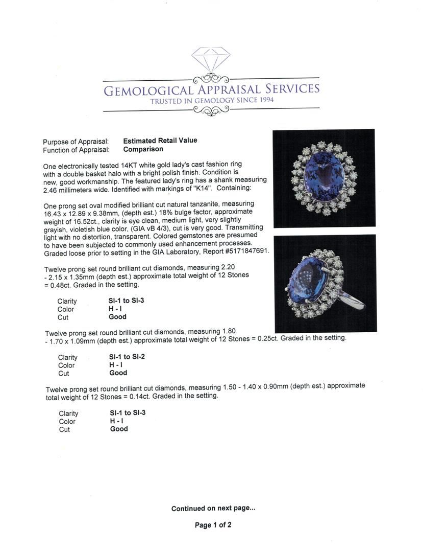 One electronically tested 14KT white gold lady's cast fashion ring with a double basket halo with a bright polish finish. The featured lady's ring has a shank measuring 2.46 millimeters wide. Identified with markings of 'K14'. Condition is new, good workmanship. Containing: One prong set oval modified brilliant cut natural tanzanite, measuring 16.43 x 12.89 x 9.38mm, (depth est.) 18%. bulge factor, approximate weight of 16.52ct., clarity is eye clean, medium light, very slightly grayish, violetish blue color, (GIA vB 4/3), cut is very good. Transmitting light with no distortion, transparent. Colored gemstones are presumed to have been subjected to commonly used enhancement processes. Graded loose prior to setting in the GIA Laboratory, Report #5171847691. Twelve prong set round brilliant cut diamonds, measuring 2.20 - 2.15 x 1.35mm (depth est.) approximate total weight of 12 Stones = 0.48ct. Graded in the setting. Clarity SI-1 to SI-3. Color: H - I Cut Good Twelve prong set round brilliant cut diamonds, measuring 1.80 - 1.70 x 1.09mm (depth est.) approximate total weight of 12 Stones = 0.25ct. Graded in the setting. Clarity SI-1 to SI-2. Color: H - I Cut Good Twelve prong set round brilliant cut diamonds, measuring 1.50 - 1.40 x 0.90mm (depth est.) approximate total weight of 12 Stones = 0.14ct. Graded in the setting. Clarity SI-1 to SI-3. Color: H - I Cut Good. Total Weight of Colored Stones 16.52ct.. Total Weight of Diamonds 0.87ct.. Total Weight of Ring 10.00gm. GAS Appraised at $20,955.00.