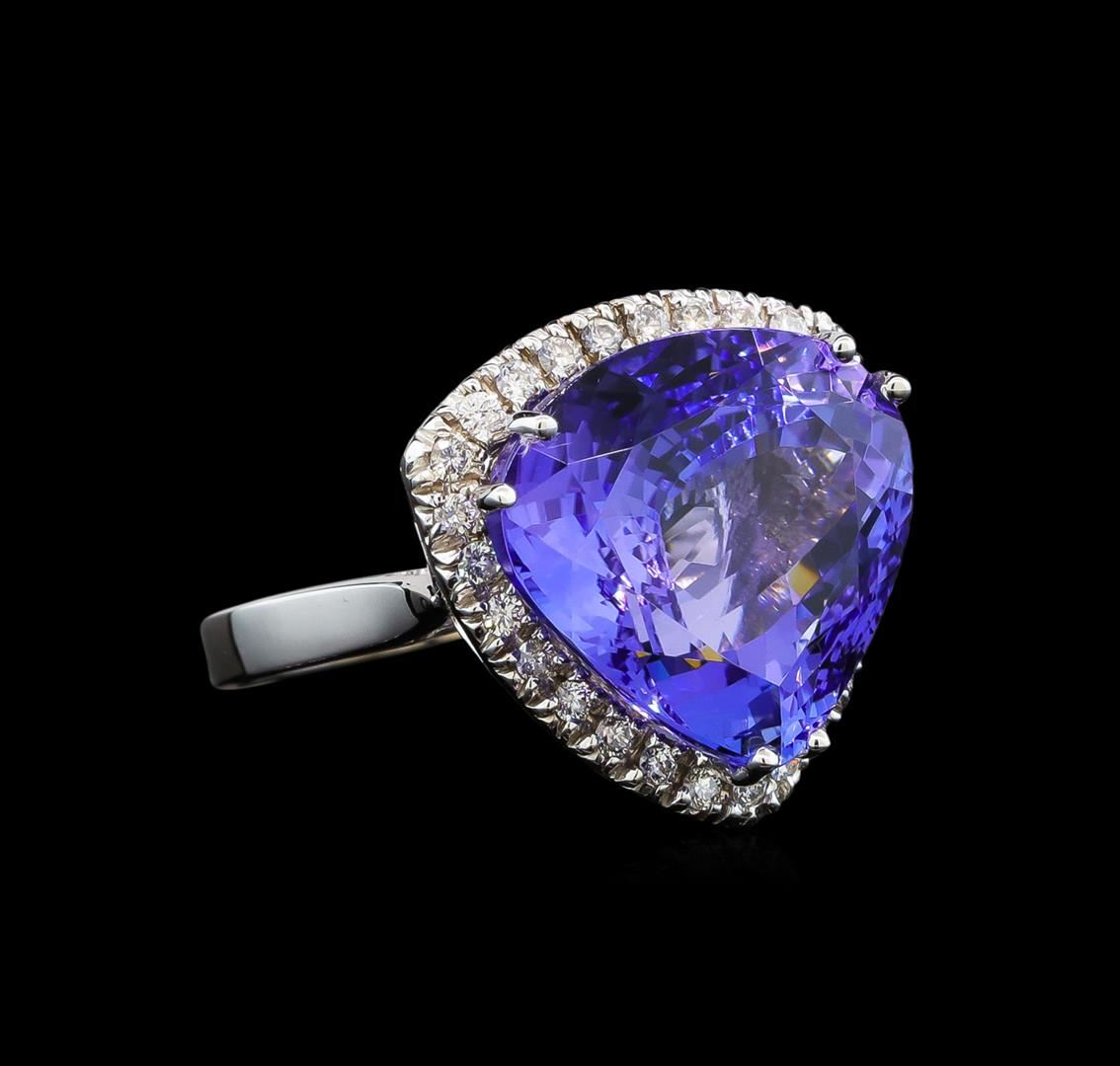 One electronically tested 14KT white gold lady's cast fashion ring with a basket halo with a bright polish finish. The featured lady's ring has a shank measuring 2.55 millimeters wide. Identified with markings of 'K14'. Condition is new, good workmanship. Containing: One prong set pear modified brilliant cut natural tanzanite, measuring 15.64 x 16.93 x 9.51mm, (depth est.) approximate weight of 16.55ct., clarity is eye clean, medium, moderately strong, violet color, (GIA V 5/4), cut is very good. Transmitting light with no distortion, transparent. Colored gemstones are presumed to have been subjected to commonly used enhancement processes. Graded loose prior to setting in the GIA Laboratory, Report #1176668296. Twenty-Seven prong set round brilliant cut diamonds, measuring 1.60 - 1.50 x 0.96mm (depth est.) approximate total weight of 27 Stones = 0.38ct. Graded in the setting. Clarity SI-1 to SI-2. Color: H - I Cut Good. Total Weight of Colored Stones 16.55ct.. Total Weight of Diamonds 0.38ct.. Total Weight of Ring 9.60gm. GAS Appraised at $24,260.00.