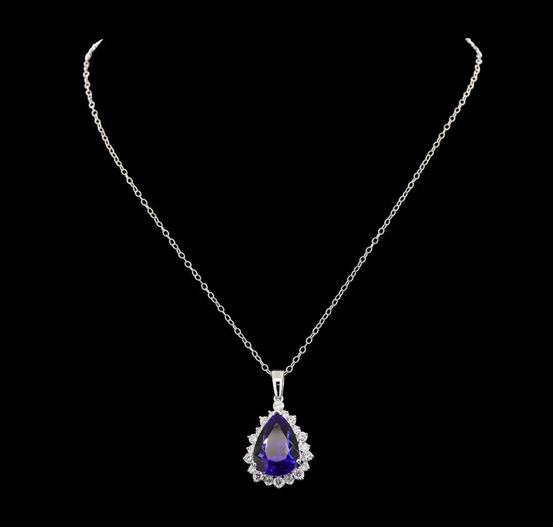 One electronically tested 14KT white gold lady's cast fashion pendant & chain 18.0' long, 1.9mm twisted oval shape link with a lobster claw clasp with a staggered basket halo with a bright polish finish. Identified with markings of '14K'. Condition is new, good workmanship. Containing: One prong set pear modified brilliant cut natural tanzanite, measuring 19.86 x 13.85 x 10.09mm, (depth est.) approximate weight of 16.66ct., clarity is eye clean, dark, strong, violetish blue color, (GIA vB 7/5), cut is very good. Transmitting light with no distortion, transparent. Colored gemstones are presumed to have been subjected to commonly used enhancement processes. Graded loose prior to setting in the GIA Laboratory, Report #5171847879. Ten prong set round brilliant cut diamonds, measuring 3.10 - 3.05 x 1.91mm (depth est.) approximate total weight of 10 Stones = 1.12ct. Graded in the setting. Clarity SI-1 to SI-2. Color: H - I Cut Good Ten prong set round brilliant cut diamonds, measuring 2.60 - 2.55 x 1.60mm (depth est.) approximate total weight of 10 Stones = 0.65ct. Graded in the setting. Clarity SI-1 to I-1. Color: H - I Cut Good. Total Weight of Colored Stones 16.66ct.. Total Weight of Diamonds 1.77ct.. Total Weight of Pendant & Chain 11.10gm. GAS Appraised at $29,290.00.