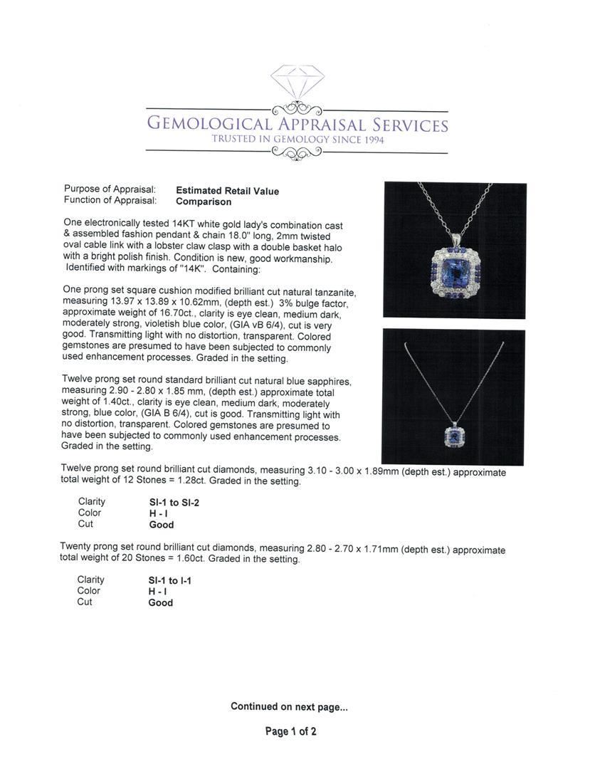 One electronically tested 14KT white gold lady's combination cast & assembled fashion pendant & chain 18.0' long, 2mm twisted oval cable link with a lobster claw clasp with a double basket halo with a bright polish finish. Identified with markings of '14K'. Condition is new, good workmanship. Containing: One prong set square cushion modified brilliant cut natural tanzanite, measuring 13.97 x 13.89 x 10.62mm, (depth est.) 3%. bulge factor, approximate weight of 16.70 ct., clarity is eye clean, medium dark, moderately strong, violetish blue color, (GIA vB 6/4), cut is very good. Transmitting light with no distortion, transparent. Colored gemstones are presumed to have been subjected to commonly used enhancement processes. Graded in the setting. Twelve prong set round standard brilliant cut natural blue sapphires, measuring 2.90 - 2.80 x 1.85 mm, (depth est.) approximate total weight of 1.40 ct., clarity is eye clean, medium dark, moderately strong, blue color, (GIA B 6/4), cut is good. Transmitting light with no distortion, transparent. Colored gemstones are presumed to have been subjected to commonly used enhancement processes. Graded in the setting. Twelve prong set round brilliant cut diamonds, measuring 3.10 - 3.00 x 1.89mm (depth est.) approximate total weight of 12 Stones = 1.28ct. Graded in the setting. Clarity SI-1 to SI-2. Color: H - I Cut Good Twenty prong set round brilliant cut diamonds, measuring 2.80 - 2.70 x 1.71mm (depth est.) approximate total weight of 20 Stones = 1.60 ct. Graded in the setting. Clarity SI-1 to I-1. Color: H - I Cut Good. Total Weight of Colored Stones 18.10 ct.. Total Weight of Diamonds 2.88ct.. Total Weight of Pendant & Chain 16.30gm. GAS Appraised.