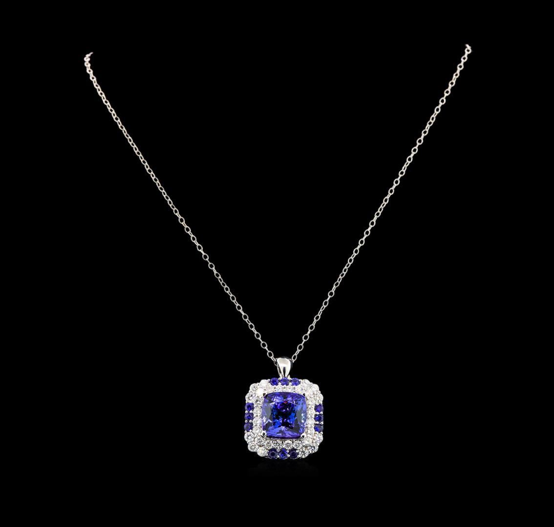 One electronically tested 14KT white gold lady's combination cast & assembled fashion pendant & chain 18.0' long, 2mm twisted oval cable link with a lobster claw clasp with a double basket halo with a bright polish finish. Identified with markings of '14K'. Condition is new, good workmanship. Containing: One prong set square cushion modified brilliant cut natural tanzanite, measuring 13.97 x 13.89 x 10.62mm, (depth est.) 3%. bulge factor, approximate weight of 16.70 ct., clarity is eye clean, medium dark, moderately strong, violetish blue color, (GIA vB 6/4), cut is very good. Transmitting light with no distortion, transparent. Colored gemstones are presumed to have been subjected to commonly used enhancement processes. Graded in the setting. Twelve prong set round standard brilliant cut natural blue sapphires, measuring 2.90 - 2.80 x 1.85 mm, (depth est.) approximate total weight of 1.40 ct., clarity is eye clean, medium dark, moderately strong, blue color, (GIA B 6/4), cut is good. Transmitting light with no distortion, transparent. Colored gemstones are presumed to have been subjected to commonly used enhancement processes. Graded in the setting. Twelve prong set round brilliant cut diamonds, measuring 3.10 - 3.00 x 1.89mm (depth est.) approximate total weight of 12 Stones = 1.28ct. Graded in the setting. Clarity SI-1 to SI-2. Color: H - I Cut Good Twenty prong set round brilliant cut diamonds, measuring 2.80 - 2.70 x 1.71mm (depth est.) approximate total weight of 20 Stones = 1.60 ct. Graded in the setting. Clarity SI-1 to I-1. Color: H - I Cut Good. Total Weight of Colored Stones 18.10 ct.. Total Weight of Diamonds 2.88ct.. Total Weight of Pendant & Chain 16.30gm. GAS Appraised.