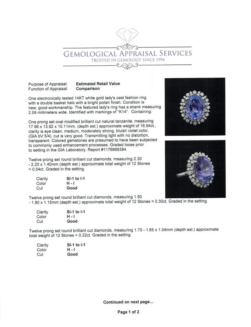 One electronically tested 14KT white gold lady's cast fashion ring with a double basket halo with a bright polish finish. The featured lady's ring has a shank measuring 2.59 millimeters wide. Identified with markings of 'K14'. Condition is new, good workmanship. Containing: One prong set oval modified brilliant cut natural tanzanite, measuring 17.96 x 13.92 x 10.11mm, (depth est.) approximate weight of 16.94ct., clarity is eye clean, medium, moderately strong, bluish violet color, (GIA bV 5/4), cut is very good. Transmitting light with no distortion, transparent. Colored gemstones are presumed to have been subjected to commonly used enhancement processes. Graded loose prior to setting in the GIA Laboratory, Report #1176668384. Twelve prong set round brilliant cut diamonds, measuring 2.30 - 2.20 x 1.40mm (depth est.) approximate total weight of 12 Stones = 0.54ct. Graded in the setting. Clarity SI-1 to I-1. Color: H - I Cut Good Twelve prong set round brilliant cut diamonds, measuring 1.90 - 1.80 x 1.15mm (depth est.) approximate total weight of 12 Stones = 0.30ct. Graded in the setting. Clarity SI-1 to I-1. Color: H - I Cut Good Twelve prong set round brilliant cut diamonds, measuring 1.70 - 1.65 x 1.04mm (depth est.) approximate total weight of 12 Stones = 0.22ct. Graded in the setting. Clarity SI-1 to I-1. Color: H - I Cut Good. Total Weight of Colored Stones 16.94ct.. Total Weight of Diamonds 1.06ct.. Total Weight of Ring 10.10gm. GAS Appraised at $26,920.00.