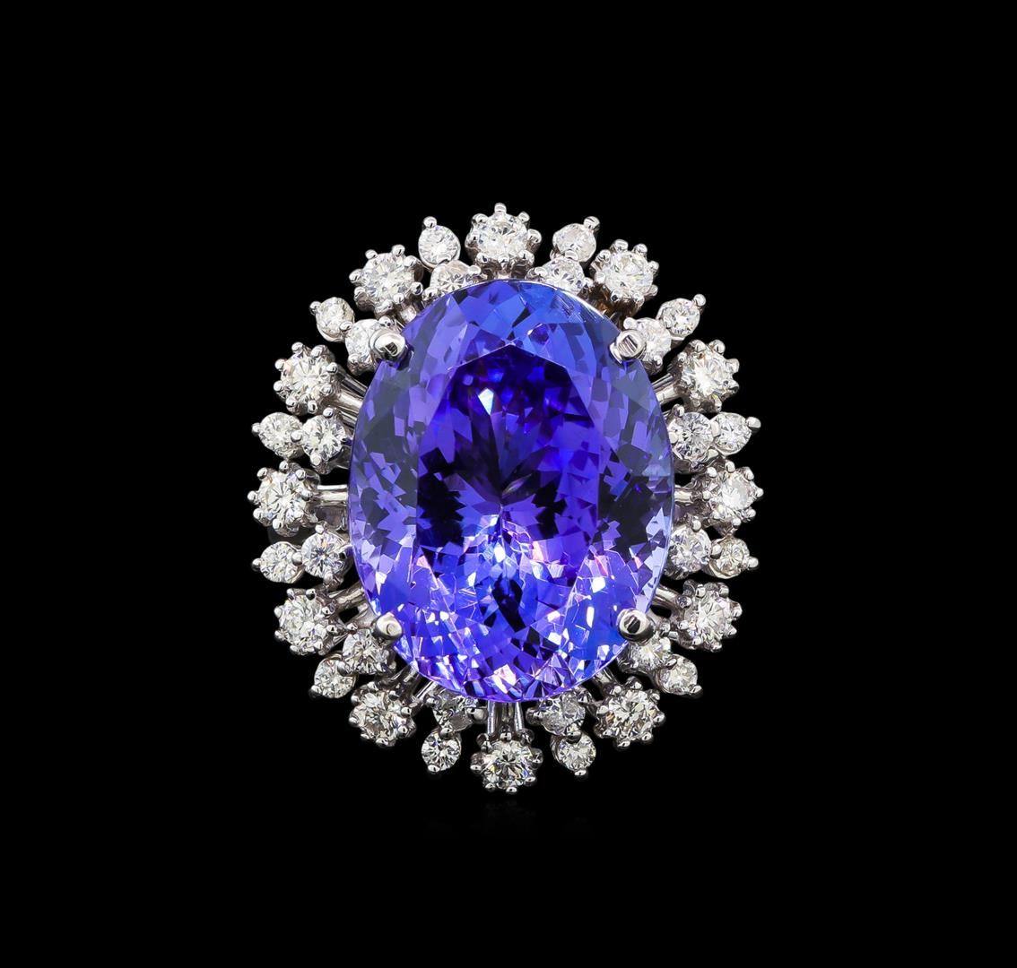 One electronically tested 14KT white gold lady's cast fashion ring with a double basket halo with a bright polish finish. The featured lady's ring has a shank measuring 2.59 millimeters wide. Identified with markings of 'K14'. Condition is new, good workmanship. Containing: One prong set oval modified brilliant cut natural tanzanite, measuring 17.96 x 13.92 x 10.11mm, (depth est.) approximate weight of 16.94ct., clarity is eye clean, medium, moderately strong, bluish violet color, (GIA bV 5/4), cut is very good. Transmitting light with no distortion, transparent. Colored gemstones are presumed to have been subjected to commonly used enhancement processes. Graded loose prior to setting in the GIA Laboratory, Report #1176668384. Twelve prong set round brilliant cut diamonds, measuring 2.30 - 2.20 x 1.40mm (depth est.) approximate total weight of 12 Stones = 0.54ct. Graded in the setting. Clarity SI-1 to I-1. Color: H - I Cut Good Twelve prong set round brilliant cut diamonds, measuring 1.90 - 1.80 x 1.15mm (depth est.) approximate total weight of 12 Stones = 0.30ct. Graded in the setting. Clarity SI-1 to I-1. Color: H - I Cut Good Twelve prong set round brilliant cut diamonds, measuring 1.70 - 1.65 x 1.04mm (depth est.) approximate total weight of 12 Stones = 0.22ct. Graded in the setting. Clarity SI-1 to I-1. Color: H - I Cut Good. Total Weight of Colored Stones 16.94ct.. Total Weight of Diamonds 1.06ct.. Total Weight of Ring 10.10gm. GAS Appraised at $26,920.00.