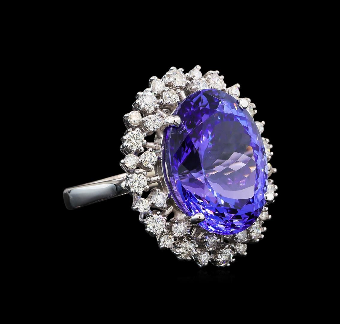 One electronically tested 14KT white gold lady's cast fashion ring with a double basket halo with a bright polish finish. The featured lady's ring has a shank measuring 2.59 millimeters wide. Identified with markings of 'K14'. Condition is new, good workmanship. Containing: One prong set oval modified brilliant cut natural tanzanite, measuring 17.96 x 13.92 x 10.11mm, (depth est.) approximate weight of 16.94ct., clarity is eye clean, medium, moderately strong, bluish violet color, (GIA bV 5/4), cut is very good. Transmitting light with no distortion, transparent. Colored gemstones are presumed to have been subjected to commonly used enhancement processes. Graded loose prior to setting in the GIA Laboratory, Report #1176668384. Twelve prong set round brilliant cut diamonds, measuring 2.30 - 2.20 x 1.40mm (depth est.) approximate total weight of 12 Stones = 0.54ct. Graded in the setting. Clarity SI-1 to I-1. Color: H - I Cut Good Twelve prong set round brilliant cut diamonds, measuring 1.90 - 1.80 x 1.15mm (depth est.) approximate total weight of 12 Stones = 0.30ct. Graded in the setting. Clarity SI-1 to I-1. Color: H - I Cut Good Twelve prong set round brilliant cut diamonds, measuring 1.70 - 1.65 x 1.04mm (depth est.) approximate total weight of 12 Stones = 0.22ct. Graded in the setting. Clarity SI-1 to I-1. Color: H - I Cut Good. Total Weight of Colored Stones 16.94ct.. Total Weight of Diamonds 1.06ct.. Total Weight of Ring 10.10gm. GAS Appraised at $26,920.00.
