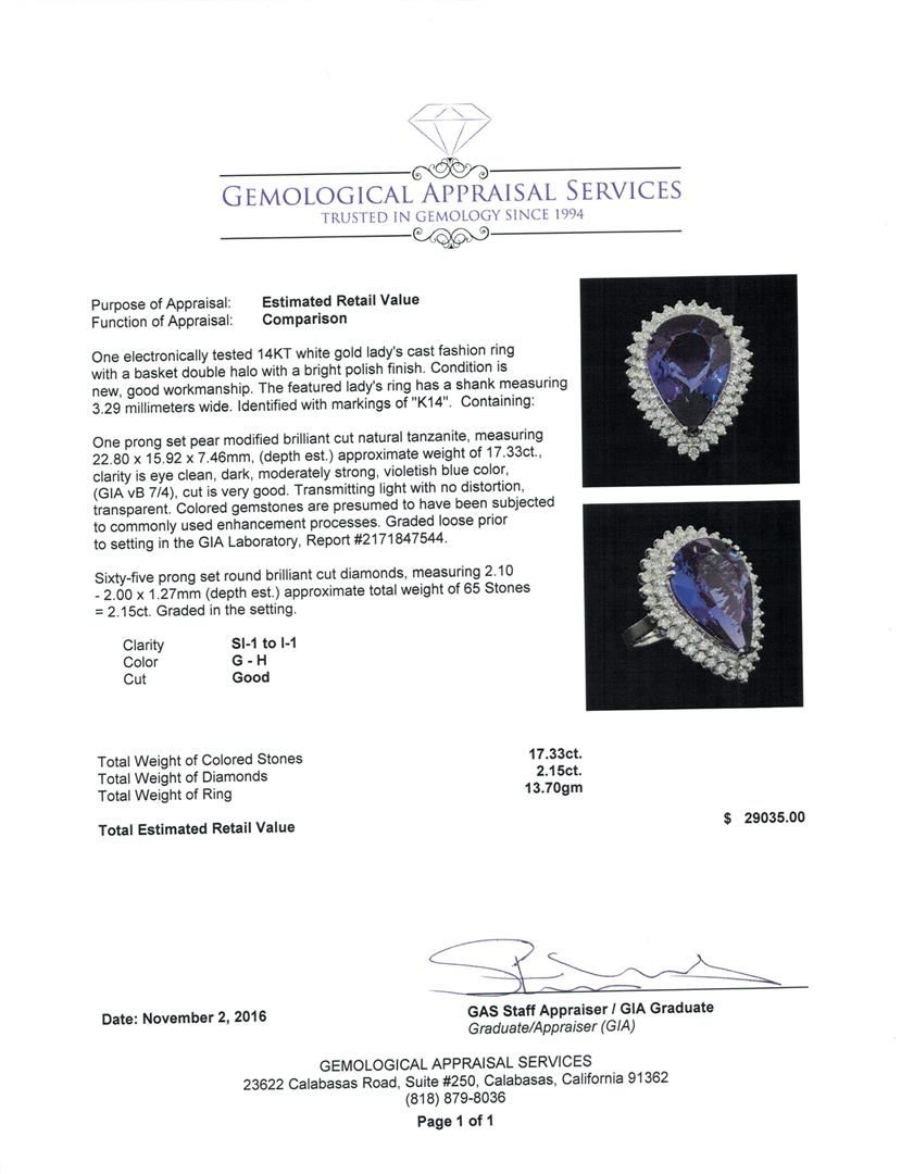 One electronically tested 14KT white gold lady's cast fashion ring with a basket double halo with a bright polish finish. The featured lady's ring has a shank measuring 3.29 millimeters wide. Identified with markings of 'K14'. Condition is new, good workmanship. Containing: One prong set pear modified brilliant cut natural tanzanite, measuring 22.80 x 15.92 x 7.46mm, (depth est.) approximate weight of 17.33ct., clarity is eye clean, dark, moderately strong, violetish blue color, (GIA vB 7/4), cut is very good. Transmitting light with no distortion, transparent. Colored gemstones are presumed to have been subjected to commonly used enhancement processes. Graded loose prior to setting in the GIA Laboratory, Report #2171847544. Sixty-Five prong set round brilliant cut diamonds, measuring 2.10 - 2.00 x 1.27mm (depth est.) approximate total weight of 65 Stones = 2.15ct. Graded in the setting. Clarity SI-1 to I-1. Color: G - H Cut Good. Total Weight of Colored Stones 17.33ct.. Total Weight of Diamonds 2.15ct.. Total Weight of Ring 13.70gm. GAS Appraised at $29,035.00.