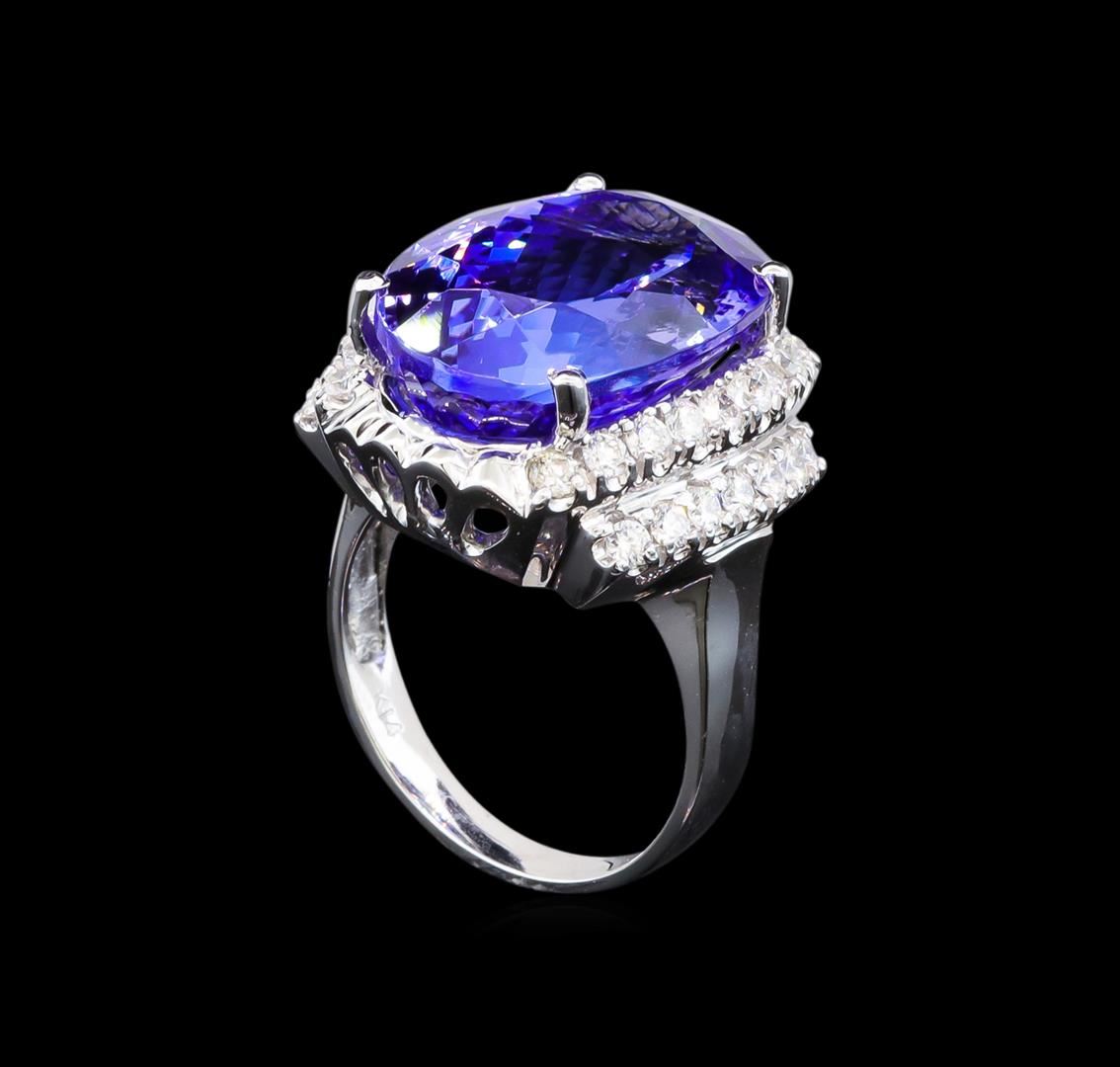 One electronically tested 14KT white gold lady's cast fashion ring with a cathedral shank with a bright polish finish. The featured lady's ring has a shank measuring 2.61 millimeters wide. Identified with markings of 'K14'. Condition is new, good workmanship. Containing: One prong set oval modified brilliant cut natural tanzanite, measuring 19.07 x 13.15 x 9.03mm, (depth est.) 10%. bulge factor, approximate total weight of 17.55ct., clarity is eye clean, medium, very slightly grayish, violet color, (GIA V 5/3), cut is very good. Transmitting light with no distortion, transparent. Colored gemstones are presumed to have been subjected to commonly used enhancement processes. Graded loose prior to setting in the GIA Laboratory, Report #5175665590. Thirty-Two prong set round brilliant cut diamonds, measuring 2.00 - 1.90 x 1.17mm (depth est.) approximate total weight of 32 Stones = 0.86ct. Graded in the setting. Clarity VS-2 to SI-1. Color: G - H Cut Good. Total Weight of Colored Stones 17.55ct.. Total Weight of Diamonds 0.86ct.. Total Weight of Ring 10.60gm. GAS Appraised at $22,645.00.