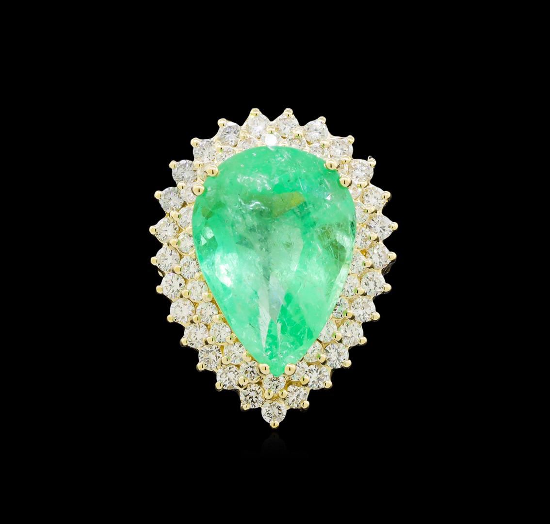 One electronically tested 14KT yellow gold lady's cast fashion ring with a double basket halo with a bright polish finish. The featured lady's ring has a shank measuring 3.03 millimeters wide. Identified with markings of "K14". Condition is new, good workmanship. Containing: One prong set pear modified brilliant cut natural emerald, measuring 21.11 x 15.01 x 10.99mm, exact weight 17.66ct., clarity is moderately included, type III, medium, very slightly grayish, green color, (GIA G 5/3), cut is good. Transmitting light somewhat diffusely, transparent to translucent. Naturally occurring internal & external characteristics are present. Clarity enhanced. Graded loose prior to setting in the GIA Laboratory, Report # 2175501599.Twenty-Seven prong set round brilliant cut diamonds, measuring 2.40 - 2.30 x 1.46mm (depth est.) approximate total weight of 27 Stones = 1.35ct. Graded in the setting. Clarity: SI-1 to SI-2. Color: H - I. Cut Good Twenty-Six prong set round brilliant cut diamonds, measuring 2.00 - 1.95 x 1.23mm (depth est.) approximate total weight of 26 Stones = 0.78ct. Graded in the setting. Clarity: VS to SI-2. Color: H - I. Cut Good. Total Weight of Colored Stones 17.66ct. Total Weight of Diamonds 2.13ct. Total Weight of Ring 13.80gm. GAS Appraised at $32,420.00.