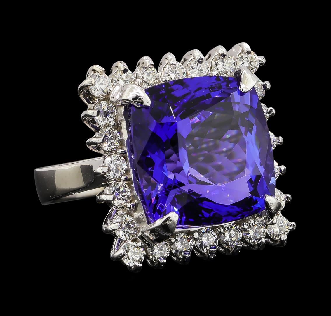 One electronically tested 14KT white gold lady's cast fashion ring with a square basket halo with a bright polish finish. The featured lady's ring has a shank measuring 3.81 millimeters wide. Identified with markings of 'K14'. Condition is new, good workmanship. Containing: One prong set square cushion modified brilliant cut natural tanzanite, measuring 15.09 x 14.75 x 10.22mm, (depth est.) approximate weight of 17.69ct., clarity is eye clean, medium dark, strong, violet color, (GIA V 6/5), cut is very good. Transmitting light with no distortion, transparent. Colored gemstones are presumed to have been subjected to commonly used enhancement processes. Graded loose prior to setting in the GIA Laboratory, Report #2171847236. Twenty-Four prong set round brilliant cut diamonds, measuring 2.50 - 2.45 x 1.51mm (depth est.) approximate total weight of 24 Stones = 1.35ct. Graded in the setting. Clarity SI-1 to SI-2. Color: H - I Cut Good. Total Weight of Colored Stones 17.69ct.. Total Weight of Diamonds 1.35ct.. Total Weight of Ring 13.30gm. GAS Appraised at $29,660.00.