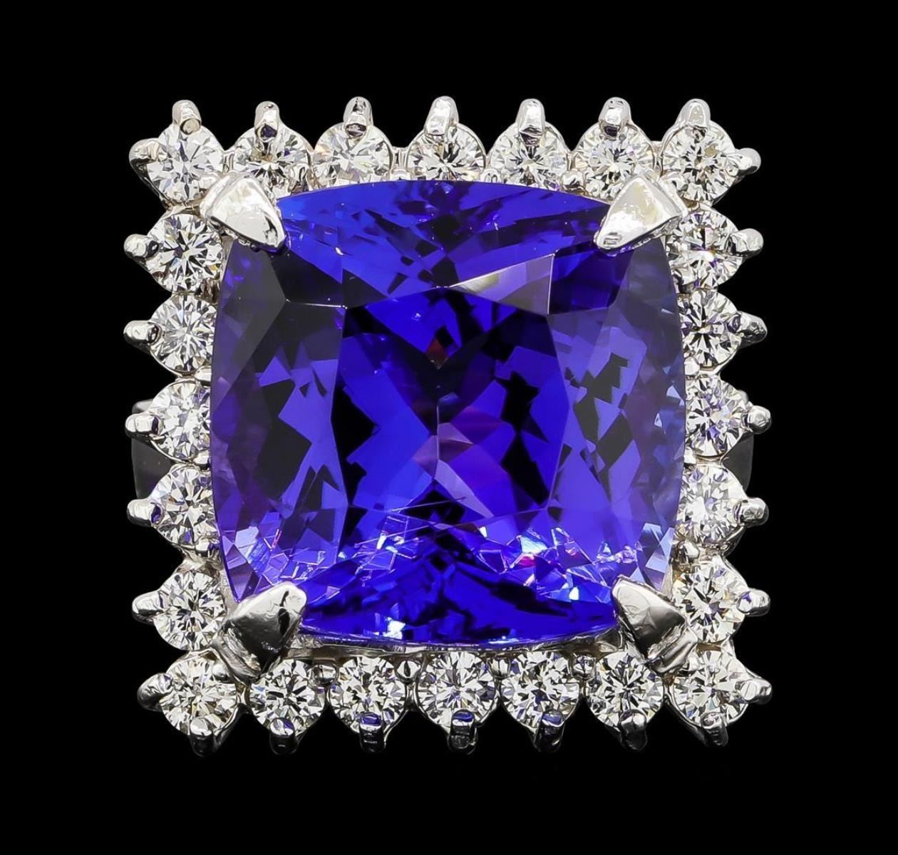 One electronically tested 14KT white gold lady's cast fashion ring with a square basket halo with a bright polish finish. The featured lady's ring has a shank measuring 3.81 millimeters wide. Identified with markings of 'K14'. Condition is new, good workmanship. Containing: One prong set square cushion modified brilliant cut natural tanzanite, measuring 15.09 x 14.75 x 10.22mm, (depth est.) approximate weight of 17.69ct., clarity is eye clean, medium dark, strong, violet color, (GIA V 6/5), cut is very good. Transmitting light with no distortion, transparent. Colored gemstones are presumed to have been subjected to commonly used enhancement processes. Graded loose prior to setting in the GIA Laboratory, Report #2171847236. Twenty-Four prong set round brilliant cut diamonds, measuring 2.50 - 2.45 x 1.51mm (depth est.) approximate total weight of 24 Stones = 1.35ct. Graded in the setting. Clarity SI-1 to SI-2. Color: H - I Cut Good. Total Weight of Colored Stones 17.69ct.. Total Weight of Diamonds 1.35ct.. Total Weight of Ring 13.30gm. GAS Appraised.