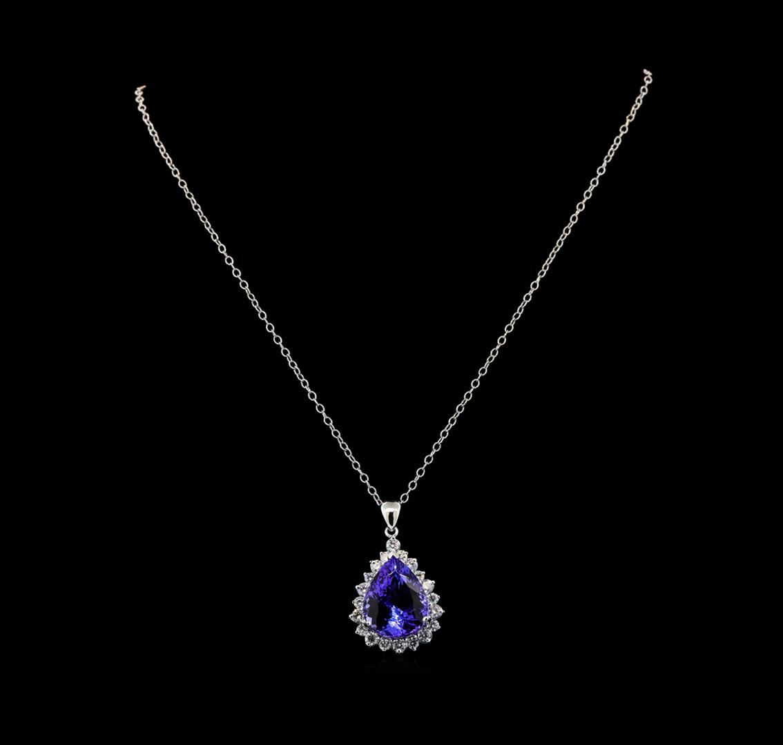 One electronically tested 14KT white gold lady's combination cast & assembled fashion pendant & chain 18.0' long, 2mm twisted oval cable link with a lobster claw clasp with a bright polish finish. Identified with markings of '14K'. Condition is new, good workmanship. Containing: One prong set pear modified brilliant cut natural tanzanite, measuring 18.95 x 15.02 x 9.76mm, (depth est.) approximate weight of 17.75ct., clarity is eye clean, medium, moderately strong, bluish violet color, (GIA bV 5/4), cut is very good. Transmitting light with no distortion, transparent. Colored gemstones are presumed to have been subjected to commonly used enhancement processes. Graded loose prior to setting in the GIA Laboratory, Report #2175668745. Ten prong set round brilliant cut diamonds, measuring 3.00 - 2.95 x 1.85mm (depth est.) approximate total weight of 10 Stones = 1.00ct. Graded in the setting. Clarity SI-1 to I-1. Color: H - I Cut Good Ten prong set round brilliant cut diamonds, measuring 2.80 - 2.75 x 1.72mm (depth est.) approximate total weight of 10 Stones = 0.81ct. Graded in the setting. Clarity SI-1 to I-1. Color: H - I Cut Good. Total Weight of Colored Stones 17.75ct.. Total Weight of Diamonds 1.81ct.. Total Weight of Pendant & Chain 11.40gm. GAS Appraised at $29,300.00.