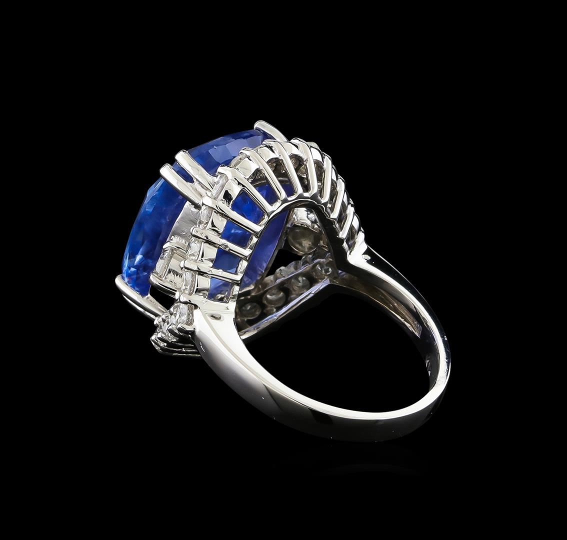 One electronically tested 14KT white gold lady's cast fashion ring with a split shank basket halo with a bright polish finish. The featured lady's ring has a shank measuring 2.94 millimeters wide. Identified with markings of "K14". Condition is new, good workmanship. Containing: One prong set rectangular cushion modified mixed cut natural blue sapphire, measuring 16.94 x 13.71 x 7.82mm, 4%. bulge factor, approximate weight of 17.78ct., clarity is slightly included, type II, medium, very slightly grayish, blue color, (GIA B 5/3), cut is very good. Transmitting light with a minimum of distortion, transparent. The featured sapphire is Sri Lankan in origin and has no indications of heating. Graded loose prior to setting in the GIA Laboratory, Report #1172501854.Two prong set round brilliant cut diamonds, measuring 3.30 - 3.20 x 2.02mm (depth est.) approximate total weight of 2 Stones = 0.26ct. Graded in the setting. Clarity: VS-2 to SI-1. Color: H - I. Cut Good Twenty-Four prong set round brilliant cut diamonds, measuring 2.60 - 2.50 x 1.53mm (depth est.) approximate total weight of 24 Stones = 1.44ct. Graded in the setting. Clarity: SI-1 to SI-2. Color: G - Good. Total Weight of Colored Stones 17.78ct. Total Weight of Diamonds 1.70ct. Total Weight of Ring 11.80gm GAS Appraised at $81,800.00.