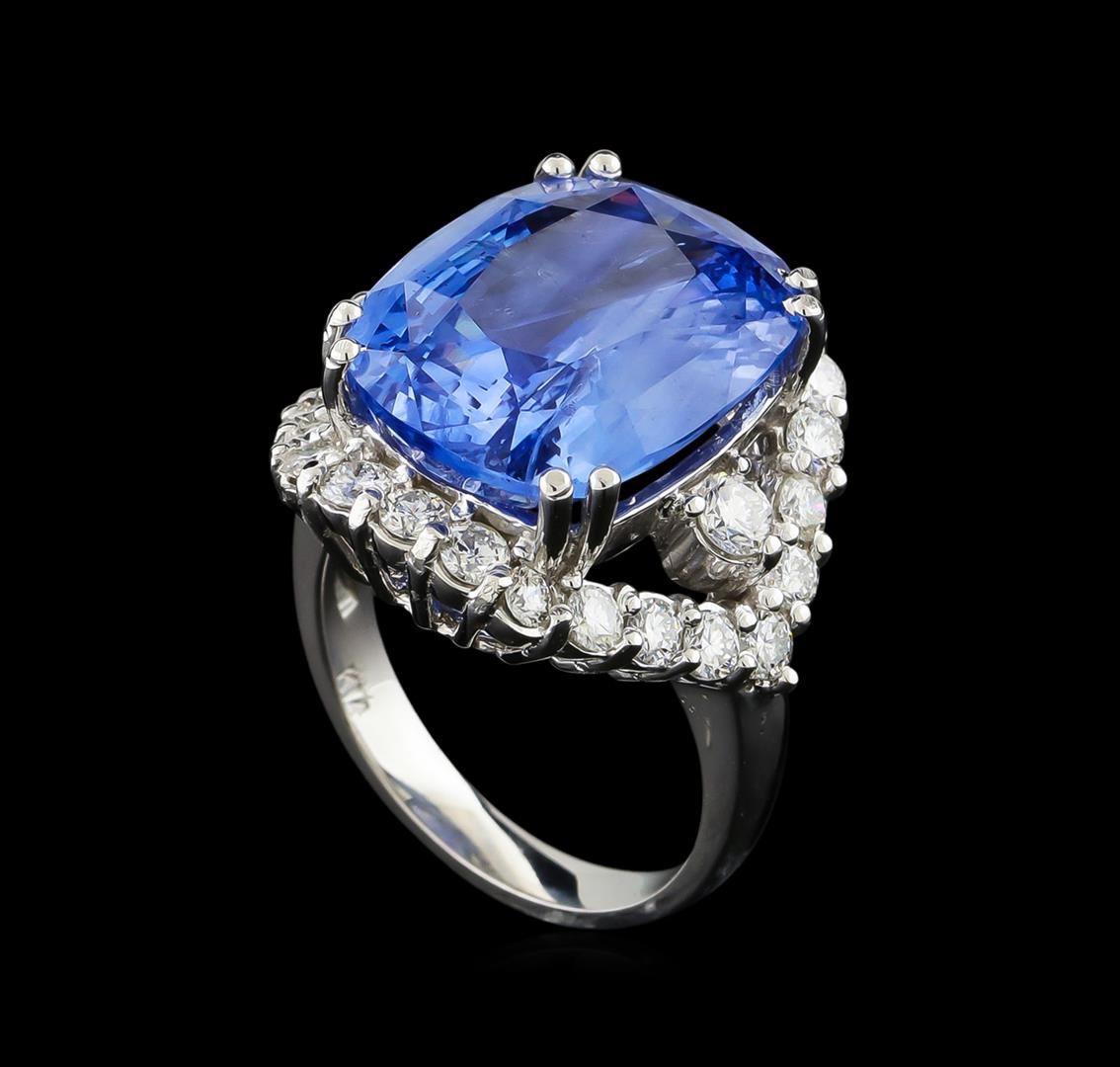 One electronically tested 14KT white gold lady's cast fashion ring with a split shank basket halo with a bright polish finish. The featured lady's ring has a shank measuring 2.94 millimeters wide. Identified with markings of "K14". Condition is new, good workmanship. Containing: One prong set rectangular cushion modified mixed cut natural blue sapphire, measuring 16.94 x 13.71 x 7.82mm, 4%. bulge factor, approximate weight of 17.78ct., clarity is slightly included, type II, medium, very slightly grayish, blue color, (GIA B 5/3), cut is very good. Transmitting light with a minimum of distortion, transparent. The featured sapphire is Sri Lankan in origin and has no indications of heating. Graded loose prior to setting in the GIA Laboratory, Report #1172501854.Two prong set round brilliant cut diamonds, measuring 3.30 - 3.20 x 2.02mm (depth est.) approximate total weight of 2 Stones = 0.26ct. Graded in the setting. Clarity: VS-2 to SI-1. Color: H - I. Cut Good Twenty-Four prong set round brilliant cut diamonds, measuring 2.60 - 2.50 x 1.53mm (depth est.) approximate total weight of 24 Stones = 1.44ct. Graded in the setting. Clarity: SI-1 to SI-2. Color: G - Good. Total Weight of Colored Stones 17.78ct. Total Weight of Diamonds 1.70ct. Total Weight of Ring 11.80gm GAS Appraised at $81,800.00.