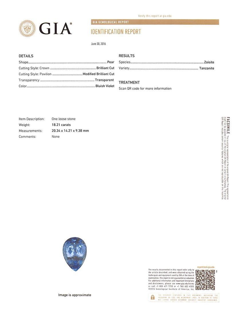 One electronically tested 14KT white gold ladies cast & assembled tanzanite and diamond pendant with chain. The pendant features a tanzanite set within a diamond floret, completed by a white gold bail. The pendant is supported by a twenty inch length 14KT white gold patterned cable chain, terminating in a lobster claw clasp. Bright polish finish Condition is new, good workmanship. Containing: One prong set pear modified brilliant cut natural tanzanite, measuring 20.34 x 14.21 x 9.38mm, exact weight 18.21ct., clarity is eye clean, type I, medium dark, very slightly grayish, bluish violet color, (GIA bV 6/3), cut is good. Transmitting light with no distortion, transparent. GIA Gemological Report attached. Graded loose prior to setting in the GIA Laboratory, Report #2175668644Tanzanite is a very rare gemstone that is only found in the country of Tanzania. Originally discovered in 1967. Tiffany & Company, named the stone Tanzanite. It is found in the Usumburu Mountains that border the Umba Valley of northern Tanzania. Tanzanite occurs in gray, brown, violet, blue, reddish-purple, & green. The gem is interesting because of its exceptional pleochroism. Rotated in different directions a tanzanite will exhibit multiple changes of color. Tanzanite has a low tolerance to ultrasonic cleaning, and should not be cleaned using this method. Nine prong set round brilliant cut diamonds, measuring 2.90 - 2.90 x 1.74mm (depth est.) approximate total weight of 9 Stones = 0.84ct. Graded in the setting. Clarity I-1 to I-2. Color: G - H Eleven prong set round brilliant cut diamonds, measuring 2.50 - 2.50 x 1.50mm (depth est.) approximate total weight of 11 Stones = 0.66ct. Graded in the setting. Clarity I-1 to I-2. Color: G - I. Total Weight of Colored Stones 18.21ct.. Total Weight of Diamonds 1.50ct.. Total Weight of Pendant With Chain 13.34gm. AIG Appraised at $45,920.00.