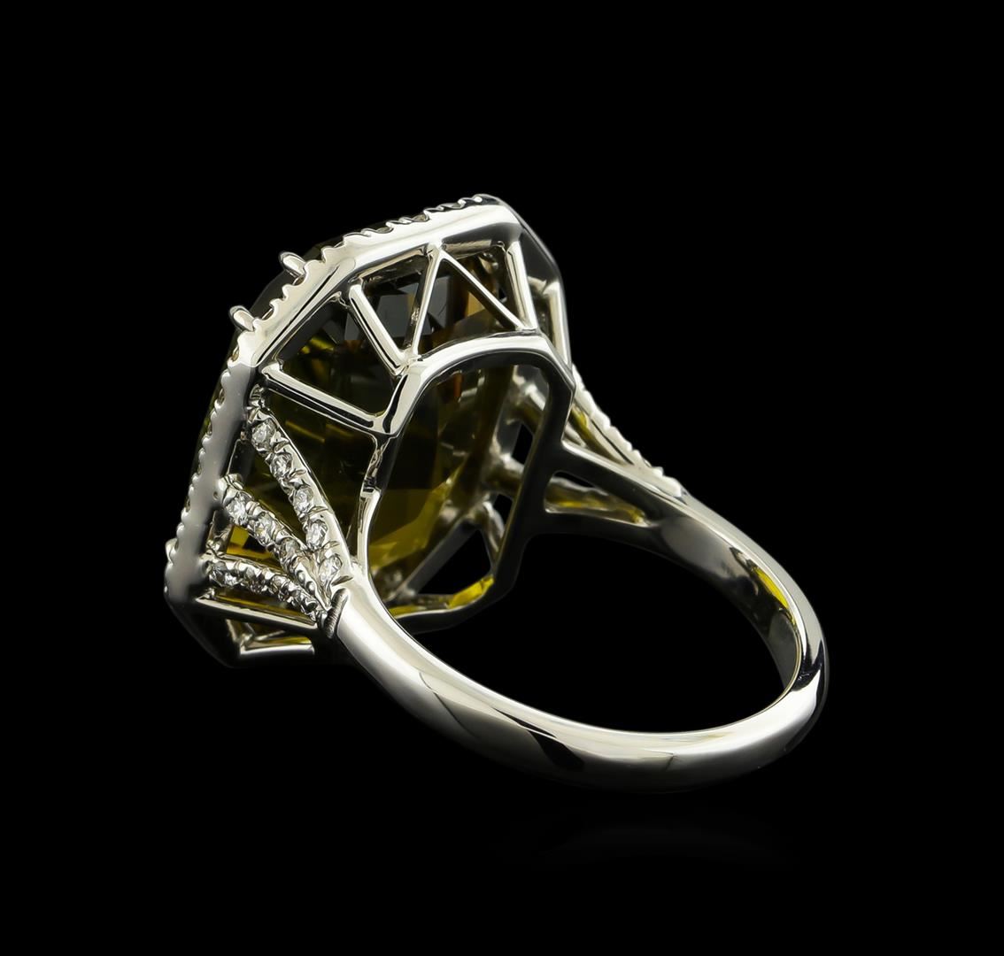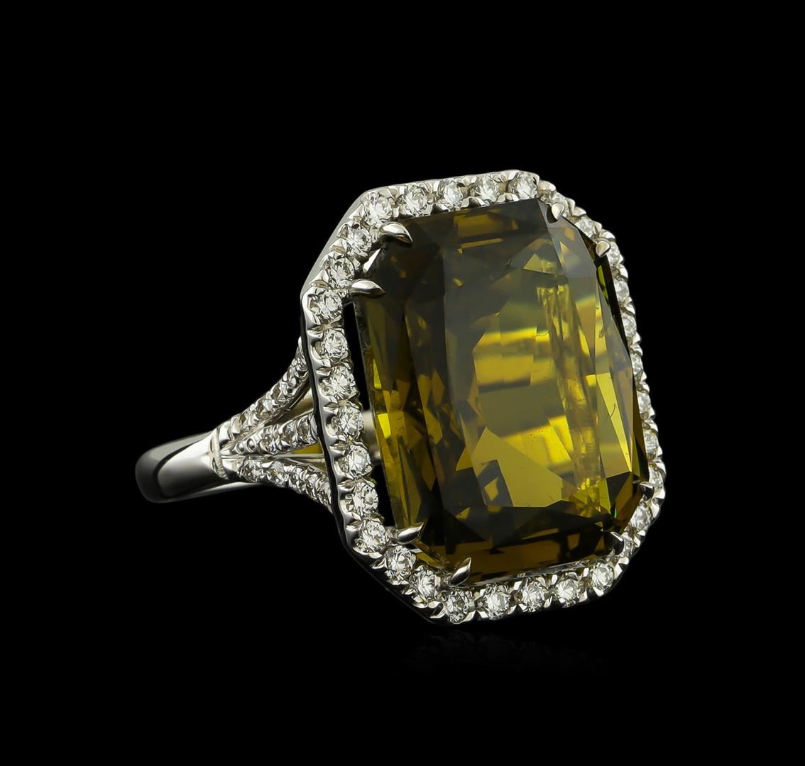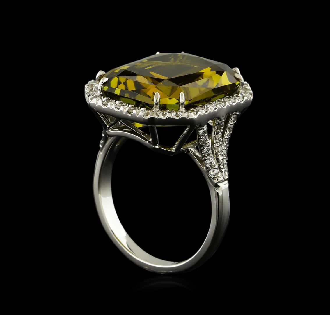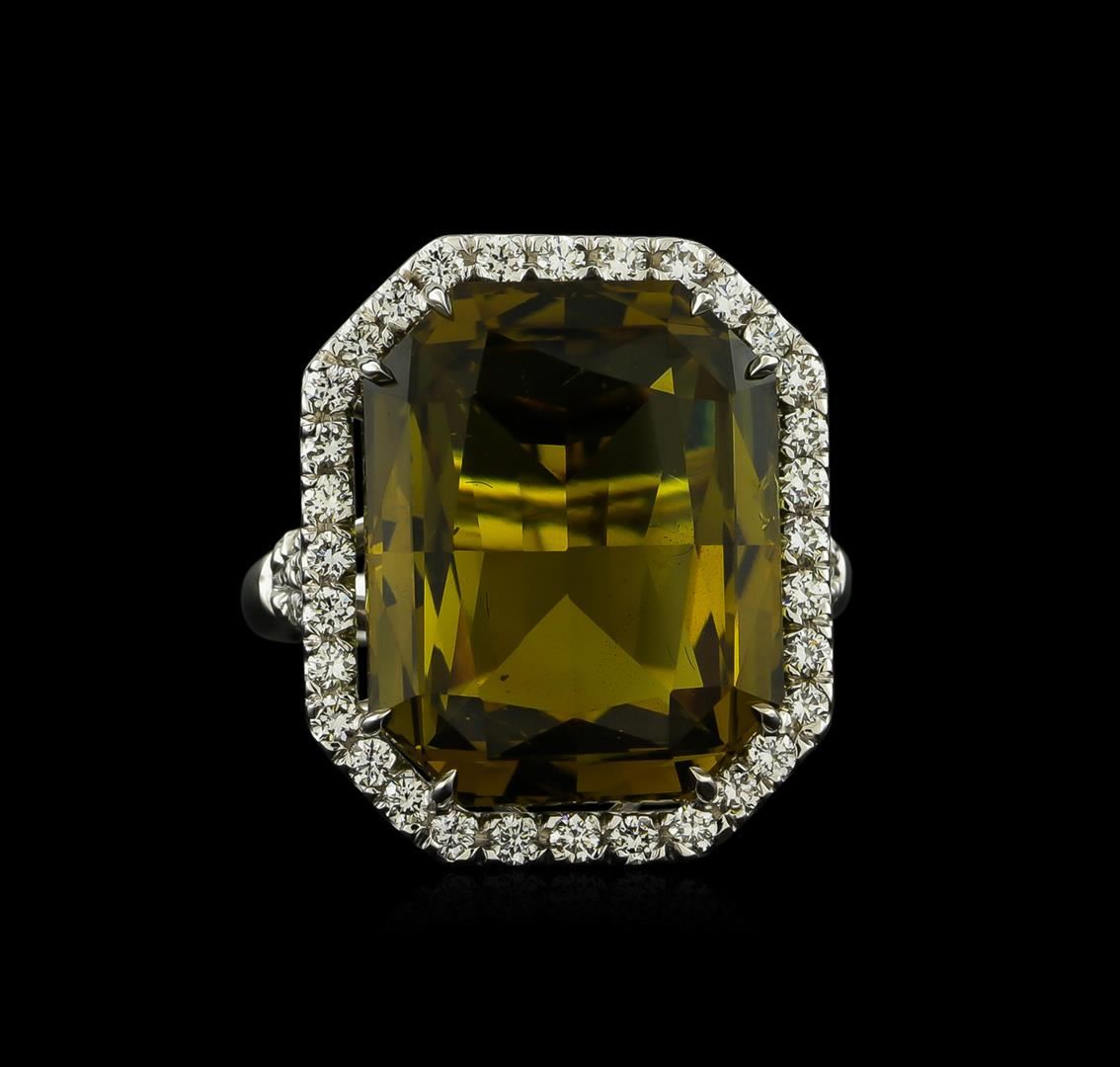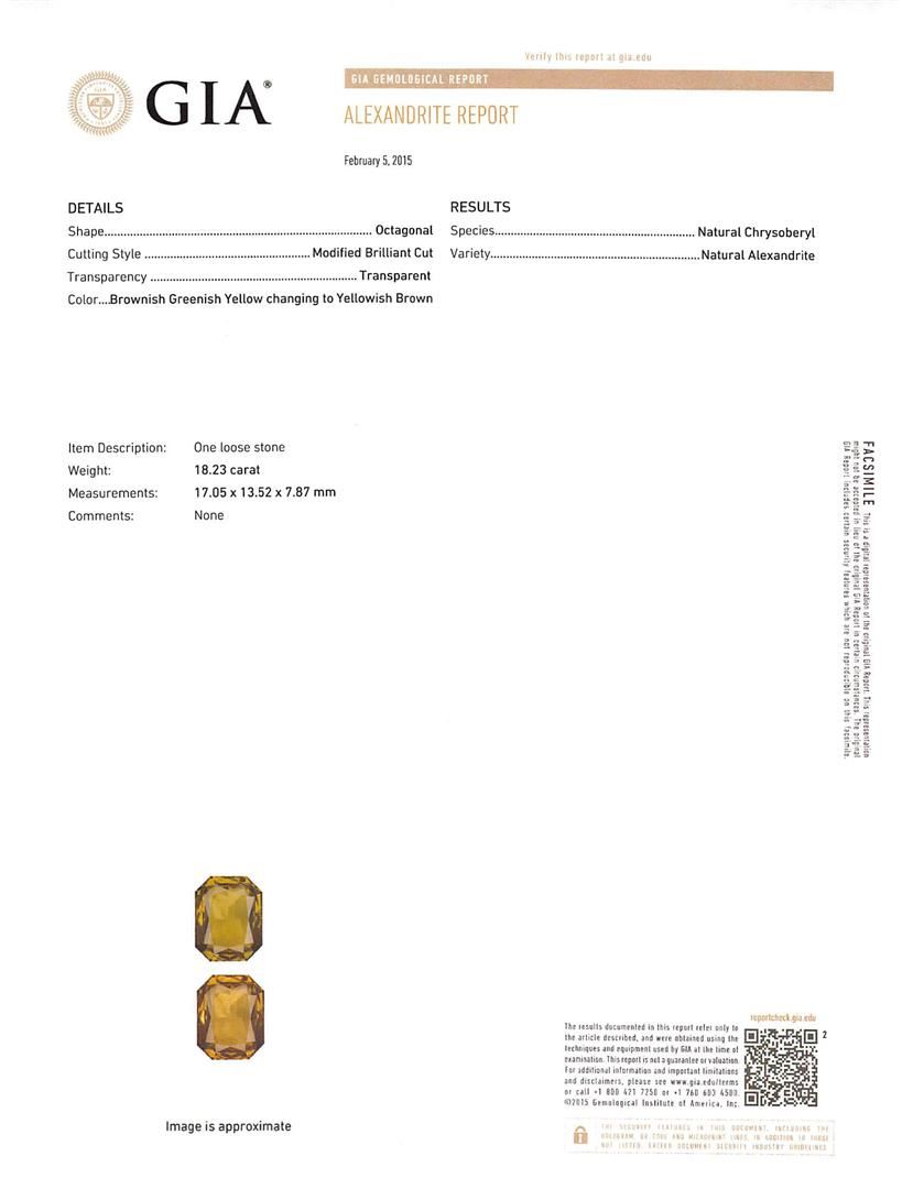 One electronically tested 18KT white gold ladies cast alexandrite and diamond ring with a bright polish finish. The featured alexandrite is set within a diamond bezel supported by diamond set three-way split shoulders, completed by a two and one-half millimeter wide band. Identified with markings of "18K". Condition is new, good workmanship. Containing: One prong set octagonal modified brilliant cut natural alexandrite, measuring 17.05 x 13.52 x 7.87mm, exact weight 18.23ct., type II Clarity is eye clean, medium dark, very slightly grayish, brownish greenish yellow color, (GIA brgY 6/3) to medium dark, very slightly grayish, yellowish brown, (GIA yBr 6/3), cut is good. Transmitting light with no distortion, transparent. GIA Gemological Report attached. Graded loose prior to setting in the GIA Laboratory, Report #1166996936. Alexandrite was discovered in the 1830's near the Tokovaya River in the Ural Mountains of Siberian Russia. It later became the national gemstone of Russia. The name "alexandrite" became official in 1842. Alexandrite is a variety of chrysoberyl. It contains both beryllium and chromium. It is the chromium that accounts for the spectacular color change. The color change is the primary qualification for a chrysoberyl to be considered alexandrite. Alexandrite is strongly trichroic. Its color change results in a near-equal transmission of the blue-green and red portions of the spectrum, coupled with strong absorption in the yellow. Today Alexandrite is found in Brazil, India, Madagascar, Myanmar, Russia, Sri Lanka, Tanzania and Zimbabwe. Forty-Seven prong set round brilliant cut diamonds, measuring 1.60 - 1.50 x 0.93mm (depth est.) approximate total weight of 47 Stones = 0.74ct. Graded in the setting. Clarity: VVS-1 to VVS-2 Color E - G Twenty-Six prong set round brilliant cut diamonds, measuring 1.30 - 1.30 x 0.78mm (depth est.) approximate total weight of 26 Stones = 0.30ct. Graded in the setting. Clarity: VVS-1 to VVS-2 Color E - G. Total Weight of Colored Stones 18.23ct. Total Weight of Diamonds 1.04ct. Total Weight of Ring 9.01gm. GIA Appraised.
