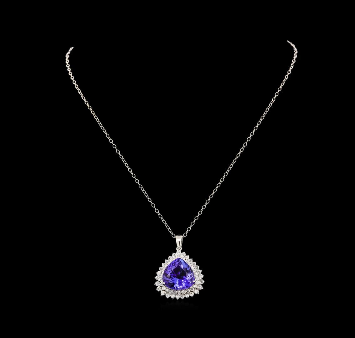 One electronically tested 14KT white gold lady's combination cast & assembled fashion pendant & chain 18.0' long, 2mm twisted oval cable link with a lobster claw clasp with a double basket halo with a bright polish finish. Identified with markings of '14K'. Condition is new, good workmanship. Containing: One prong set pear modified brilliant cut natural tanzanite, measuring 17.07 x 16.94 x 10.32mm, (depth est.) approximate weight of 18.48ct., clarity is eye clean, medium dark, moderately strong, violet color, (GIA V 6/4), cut is very good. Transmitting light with no distortion, transparent. Colored gemstones are presumed to have been subjected to commonly used enhancement processes. Graded loose prior to setting in the GIA Laboratory, Report #1176668737. Twenty-Eight prong set round brilliant cut diamonds, measuring 2.40 - 2.30 x 1.46mm (depth est.) approximate total weight of 28 Stones = 1.38ct. Graded in the setting. Clarity SI-1 to I-1. Color: H - J Cut Good Twenty-Five prong set round brilliant cut diamonds, measuring 2.10 - 2.00 x 1.23mm (depth est.) approximate total weight of 25 Stones = 0.79ct. Graded in the setting. Clarity SI-1 to I-1. Color: H - I Cut Good. Total Weight of Colored Stones 18.48ct.. Total Weight of Diamonds 2.17ct.. Total Weight of Pendant & Chain 14.30gm. GAS Appraised at $27,170.00.