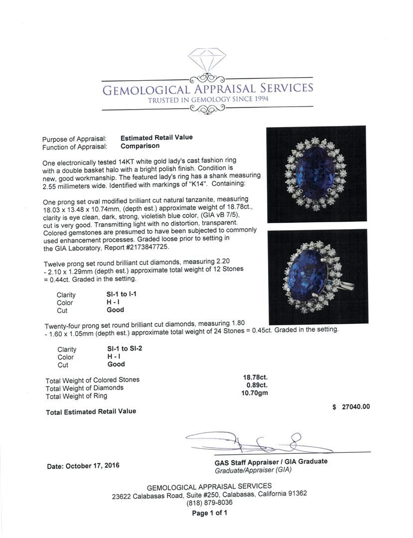 One electronically tested 14KT white gold lady's cast fashion ring with a double basket halo with a bright polish finish. The featured lady's ring has a shank measuring 2.55 millimeters wide. Identified with markings of 'K14'. Condition is new, good workmanship. Containing: One prong set oval modified brilliant cut natural tanzanite, measuring 18.03 x 13.48 x 10.74mm, (depth est.) approximate weight of 18.78ct., clarity is eye clean, dark, strong, violetish blue color, (GIA vB 7/5), cut is very good. Transmitting light with no distortion, transparent. Colored gemstones are presumed to have been subjected to commonly used enhancement processes. Graded loose prior to setting in the GIA Laboratory, Report #2173847725. Twelve prong set round brilliant cut diamonds, measuring 2.20 - 2.10 x 1.29mm (depth est.) approximate total weight of 12 Stones = 0.44ct. Graded in the setting. Clarity SI-1 to I-1. Color: H - I Cut Good Twenty-Four prong set round brilliant cut diamonds, measuring 1.80 - 1.60 x 1.05mm (depth est.) approximate total weight of 24 Stones = 0.45ct. Graded in the setting. Clarity SI-1 to SI-2. Color: H - I Cut Good. Total Weight of Colored Stones 18.78ct.. Total Weight of Diamonds 0.89ct.. Total Weight of Ring 10.70gm. GAS Appraised at $27,040.00.