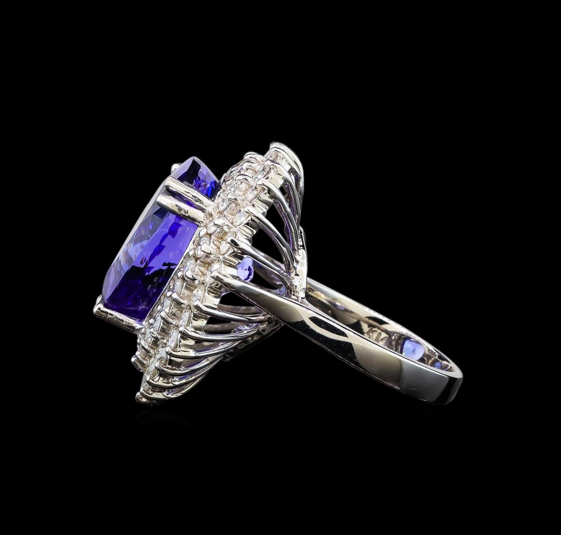 One electronically tested 14KT white gold lady's cast fashion ring with a double basket halo with a bright polish finish. The featured lady's ring has a shank measuring 3.08 millimeters wide. Identified with markings of 'K14'. Condition is new, good workmanship. Containing: One prong set pear modified brilliant cut natural tanzanite, measuring 16.26 x 16.32 x 11.10mm, (depth est.) approximate weight of 19.04ct., clarity is eye clean, medium dark, moderately strong, bluish violet color, (GIA bV 6/4), cut is very good. Transmitting light with no distortion, transparent. Colored gemstones are presumed to have been subjected to commonly used enhancement processes. Graded loose prior to setting in the GIA Laboratory, Report #5172668346. Twenty-Six prong set round brilliant cut diamonds, measuring 2.40 - 2.30 x 1.43mm (depth est.) approximate total weight of 26 Stones = 1.26ct. Graded in the setting. Clarity SI-1 to I-1. Color: H - I Cut Good Twenty-Five prong set round brilliant cut diamonds, measuring 2.10 - 2.00 x 1.27mm (depth est.) approximate total weight of 25 Stones = 0.81ct. Graded in the setting. Clarity SI-1 to SI-2. Color: H - I Cut Good. Total Weight of Colored Stones 19.04ct.. Total Weight of Diamonds 2.07ct.. Total Weight of Ring 13.50gm. GAS Appraised at $33,950.00.
