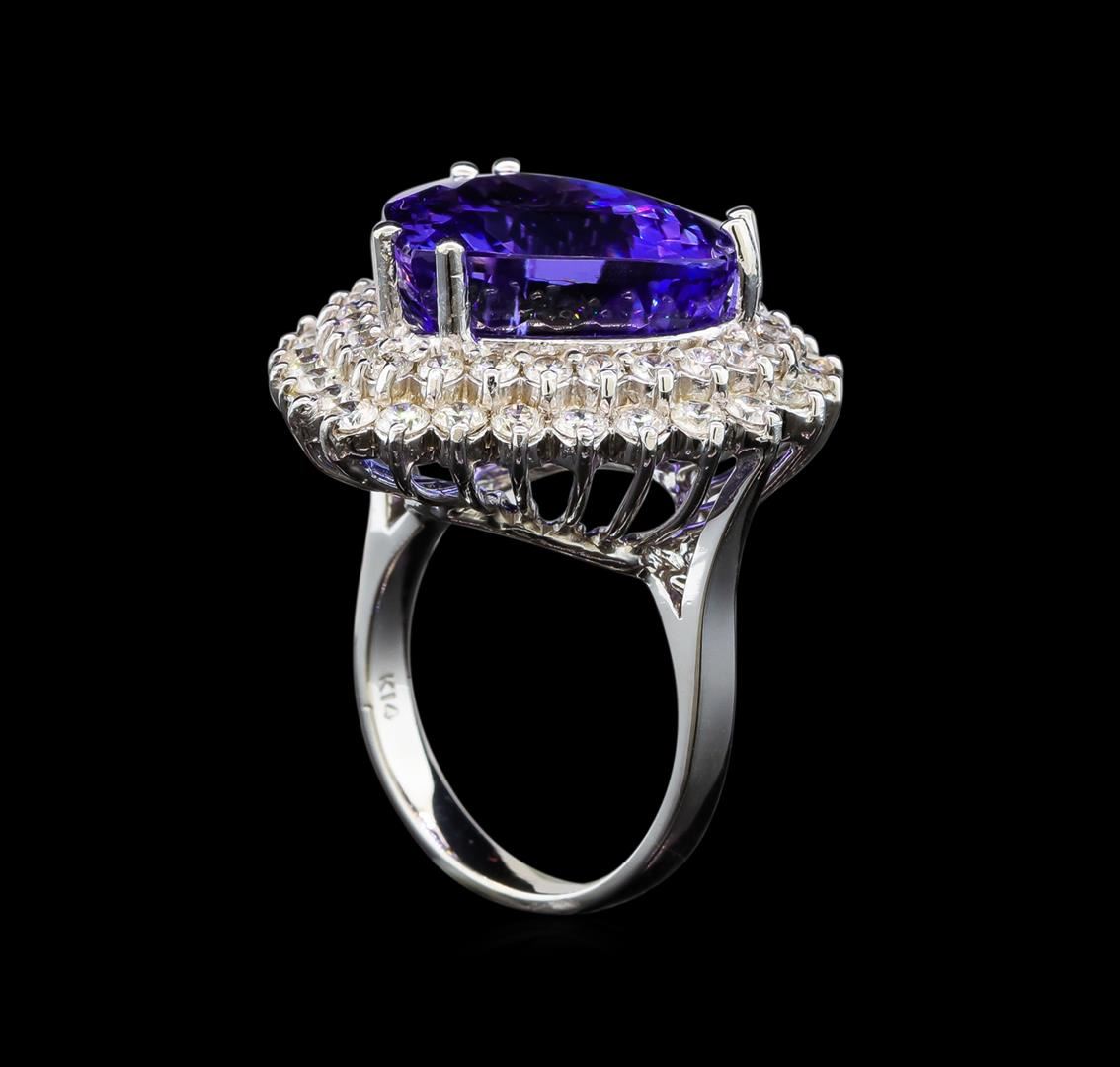 One electronically tested 14KT white gold lady's cast fashion ring with a double basket halo with a bright polish finish. The featured lady's ring has a shank measuring 3.08 millimeters wide. Identified with markings of 'K14'. Condition is new, good workmanship. Containing: One prong set pear modified brilliant cut natural tanzanite, measuring 16.26 x 16.32 x 11.10mm, (depth est.) approximate weight of 19.04ct., clarity is eye clean, medium dark, moderately strong, bluish violet color, (GIA bV 6/4), cut is very good. Transmitting light with no distortion, transparent. Colored gemstones are presumed to have been subjected to commonly used enhancement processes. Graded loose prior to setting in the GIA Laboratory, Report #5172668346. Twenty-Six prong set round brilliant cut diamonds, measuring 2.40 - 2.30 x 1.43mm (depth est.) approximate total weight of 26 Stones = 1.26ct. Graded in the setting. Clarity SI-1 to I-1. Color: H - I Cut Good Twenty-Five prong set round brilliant cut diamonds, measuring 2.10 - 2.00 x 1.27mm (depth est.) approximate total weight of 25 Stones = 0.81ct. Graded in the setting. Clarity SI-1 to SI-2. Color: H - I Cut Good. Total Weight of Colored Stones 19.04ct.. Total Weight of Diamonds 2.07ct.. Total Weight of Ring 13.50gm. GAS Appraised at $33,950.00.