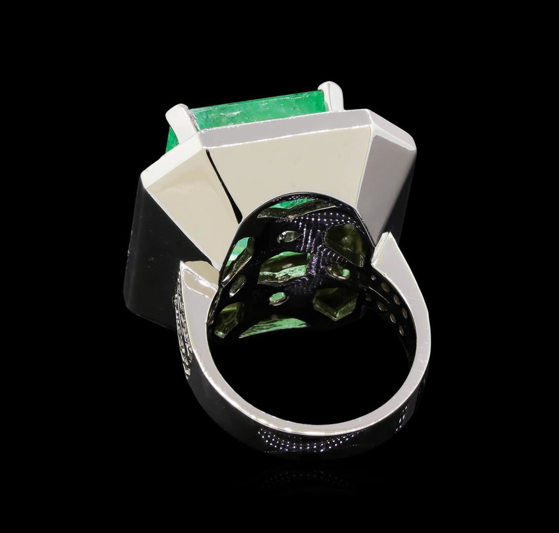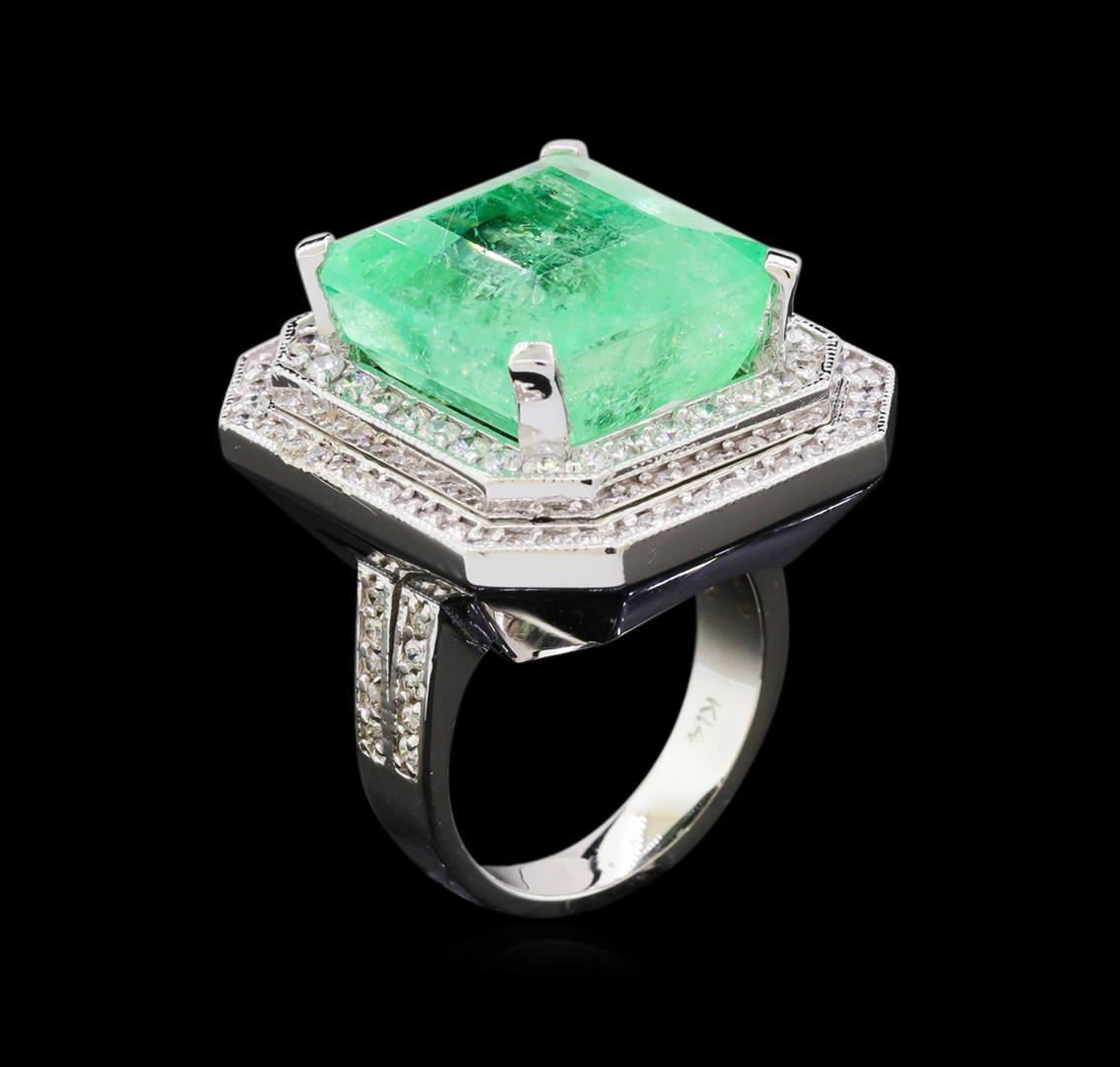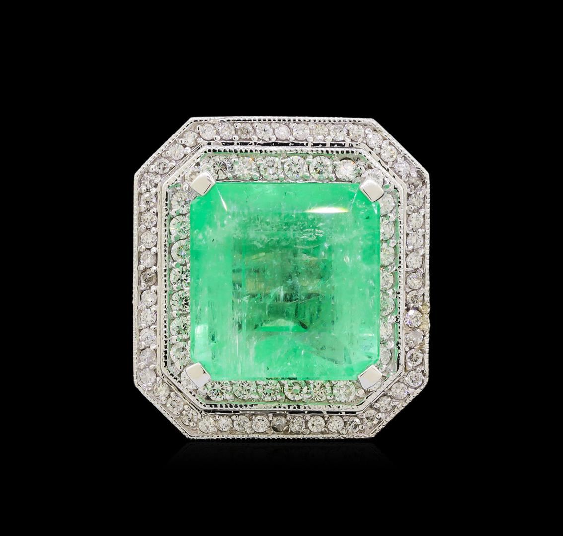 One electronically tested 14KT white gold lady's cast fashion ring with a double halo with a bright polish with milgrain detailing finish. The featured lady's ring has a shank measuring 3.79 millimeters wide. Identified with markings of "K14". Condition is new, good workmanship. Containing: One prong set emerald step cut natural emerald, measuring 15.56 x 14.96 x 10.37mm, 8%. bulge factor, exact weight 19.14ct., clarity is heavily included, type III, medium light, very slightly grayish, green color, (GIA G 4/3), cut is good. Transmitting light somewhat diffusely, semi-transparent to translucent. Naturally occurring internal & external characteristics are present. Clarity enhanced. Graded loose prior to setting in the GIA Laboratory, Report #6177501549.Thirty prong set round brilliant cut diamonds, measuring 1.95 - 1.85 x 1.18mm (depth est.) approximate total weight of 30 Stones = 0.78ct. Graded in the setting. Clarity: VS-2 to SI-2. Color: G - Very Good Seventy-Two prong set round brilliant cut diamonds, measuring 1.40 - 1.35 x 0.84mm (depth est.) approximate total weight of 72 Stones = 0.70ct. Graded in the setting. Clarity: SI-1 to I-1. Color: H - I. Cut Good. Total Weight of Colored Stones 19.14ct. Total Weight of Diamonds 1.48ct. Total Weight of Ring 21.40gm. GAS Appraised at $17,830.00.