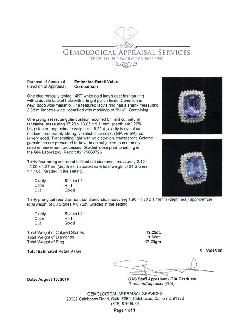 One electronically tested 14KT white gold lady's cast fashion ring with a double basket halo with a bright polish finish. The featured lady's ring has a shank measuring 2.68 millimeters wide. Identified with markings of 'K14'. Condition is new, good workmanship. Containing: One prong set rectangular cushion modified brilliant cut natural tanzanite, measuring 17.20 x 13.05 x 9.11mm, (depth est.) 20%. bulge factor, approximate weight of 19.22ct., clarity is eye clean, medium, moderately strong, violetish blue color, (GIA vB 5/4), cut is very good. Transmitting light with no distortion, transparent. Colored gemstones are presumed to have been subjected to commonly used enhancement processes. Graded loose prior to setting in the GIA Laboratory, Report #2175668725. Thirty-Four prong set round brilliant cut diamonds, measuring 2.10 - 2.00 x 1.27mm (depth est.) approximate total weight of 34 Stones = 1.10ct. Graded in the setting. Clarity SI-1 to I-1. Color: H - I Cut Good Thirty prong set round brilliant cut diamonds, measuring 1.90 - 1.80 x 1.15mm (depth est.) approximate total weight of 30 Stones = 0.72ct. Graded in the setting. Clarity SI-1 to I-1. Color: H - I Cut Good. Total Weight of Colored Stones 19.22ct.. Total Weight of Diamonds 1.82ct.. Total Weight of Ring 17.20gm. GAS Appraised at $33,615.00.