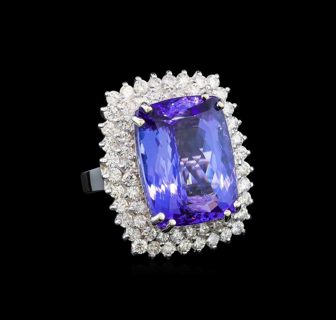 One electronically tested 14KT white gold lady's cast fashion ring with a double basket halo with a bright polish finish. The featured lady's ring has a shank measuring 2.68 millimeters wide. Identified with markings of 'K14'. Condition is new, good workmanship. Containing: One prong set rectangular cushion modified brilliant cut natural tanzanite, measuring 17.20 x 13.05 x 9.11mm, (depth est.) 20%. bulge factor, approximate weight of 19.22ct., clarity is eye clean, medium, moderately strong, violetish blue color, (GIA vB 5/4), cut is very good. Transmitting light with no distortion, transparent. Colored gemstones are presumed to have been subjected to commonly used enhancement processes. Graded loose prior to setting in the GIA Laboratory, Report #2175668725. Thirty-Four prong set round brilliant cut diamonds, measuring 2.10 - 2.00 x 1.27mm (depth est.) approximate total weight of 34 Stones = 1.10 ct. Graded in the setting. Clarity SI-1 to I-1. Color: H - I Cut Good Thirty prong set round brilliant cut diamonds, measuring 1.90 - 1.80 x 1.15mm (depth est.) approximate total weight of 30 Stones = 0.72ct. Graded in the setting. Clarity SI-1 to I-1. Color: H - I Cut Good. Total Weight of Colored Stones 19.22ct.. Total Weight of Diamonds 1.82ct.. Total Weight of Ring 17.20gm. GAS Appraised.