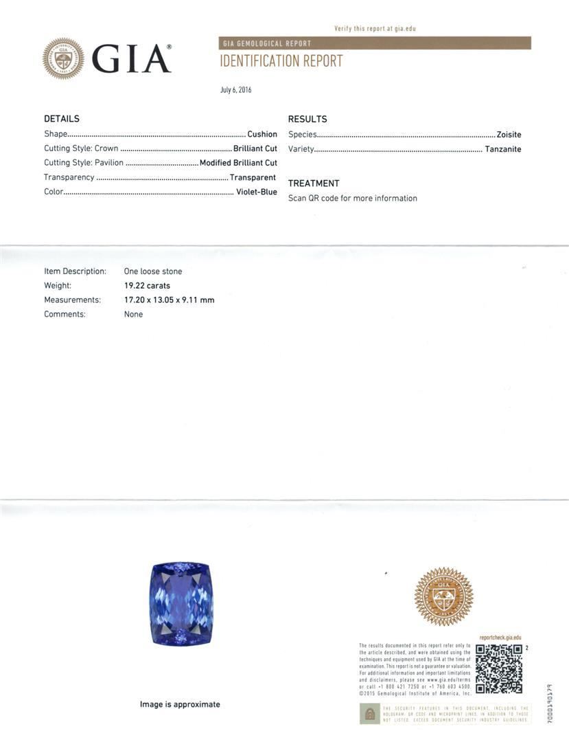 One electronically tested 14KT white gold lady's cast fashion ring with a double basket halo with a bright polish finish. The featured lady's ring has a shank measuring 2.68 millimeters wide. Identified with markings of 'K14'. Condition is new, good workmanship. Containing: One prong set rectangular cushion modified brilliant cut natural tanzanite, measuring 17.20 x 13.05 x 9.11mm, (depth est.) 20%. bulge factor, approximate weight of 19.22ct., clarity is eye clean, medium, moderately strong, violetish blue color, (GIA vB 5/4), cut is very good. Transmitting light with no distortion, transparent. Colored gemstones are presumed to have been subjected to commonly used enhancement processes. Graded loose prior to setting in the GIA Laboratory, Report #2175668725. Thirty-Four prong set round brilliant cut diamonds, measuring 2.10 - 2.00 x 1.27mm (depth est.) approximate total weight of 34 Stones = 1.10 ct. Graded in the setting. Clarity SI-1 to I-1. Color: H - I Cut Good Thirty prong set round brilliant cut diamonds, measuring 1.90 - 1.80 x 1.15mm (depth est.) approximate total weight of 30 Stones = 0.72ct. Graded in the setting. Clarity SI-1 to I-1. Color: H - I Cut Good. Total Weight of Colored Stones 19.22ct.. Total Weight of Diamonds 1.82ct.. Total Weight of Ring 17.20gm. GAS Appraised.