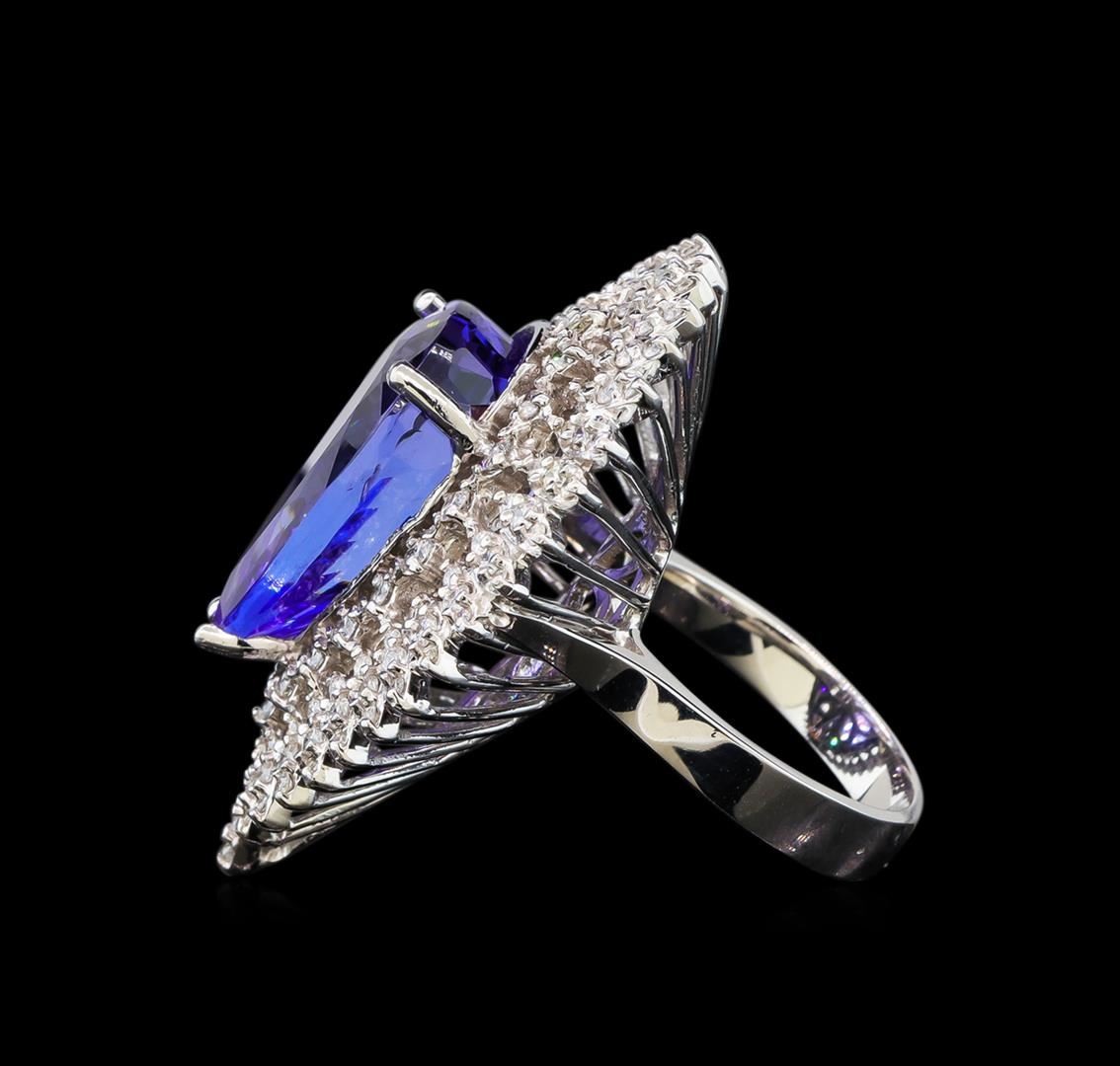 One electronically tested 14KT white gold lady's cast fashion ring with a basket halo with a bright polish finish. The featured lady's ring has a shank measuring 3.50 millimeters wide. Identified with markings of 'K14'. Condition is new, good workmanship. Containing: One prong set pear modified brilliant cut natural tanzanite, measuring 19.48 x 14.20 x 10.51mm, (depth est.) approximate weight of 19.38ct., clarity is eye clean, medium, moderately strong, violet color, (GIA V 5/4), cut is very good. Transmitting light with no distortion, transparent. Colored gemstones are presumed to have been subjected to commonly used enhancement processes. Graded loose prior to setting in the GIA Laboratory, Report #1172668615. Twenty-One prong set round brilliant cut diamonds, measuring 2.00 - 1.90 x 1.21mm (depth est.) approximate total weight of 21 Stones = 0.59ct. Graded in the setting. Clarity SI-1 to I-1. Color: H - I Cut Good Thirty-Six prong set round brilliant cut diamonds, measuring 1.45 - 1.35 x 0.87mm (depth est.) approximate total weight of 36 Stones = 0.37ct. Graded in the setting. Clarity SI-1 to I-1. Color: G - I Cut Good Seventy-Two prong set round brilliant cut diamonds, measuring 1.20 - 1.10 x 0.71mm (depth est.) approximate total weight of 72 Stones = 0.41ct. Graded in the setting. Clarity SI-1 to I-1. Color: G - I Cut Good. Total Weight of Colored Stones 19.38ct.. Total Weight of Diamonds 1.37ct.. Total Weight of Ring 16.10gm. GAS Appraised at $31,490.00.