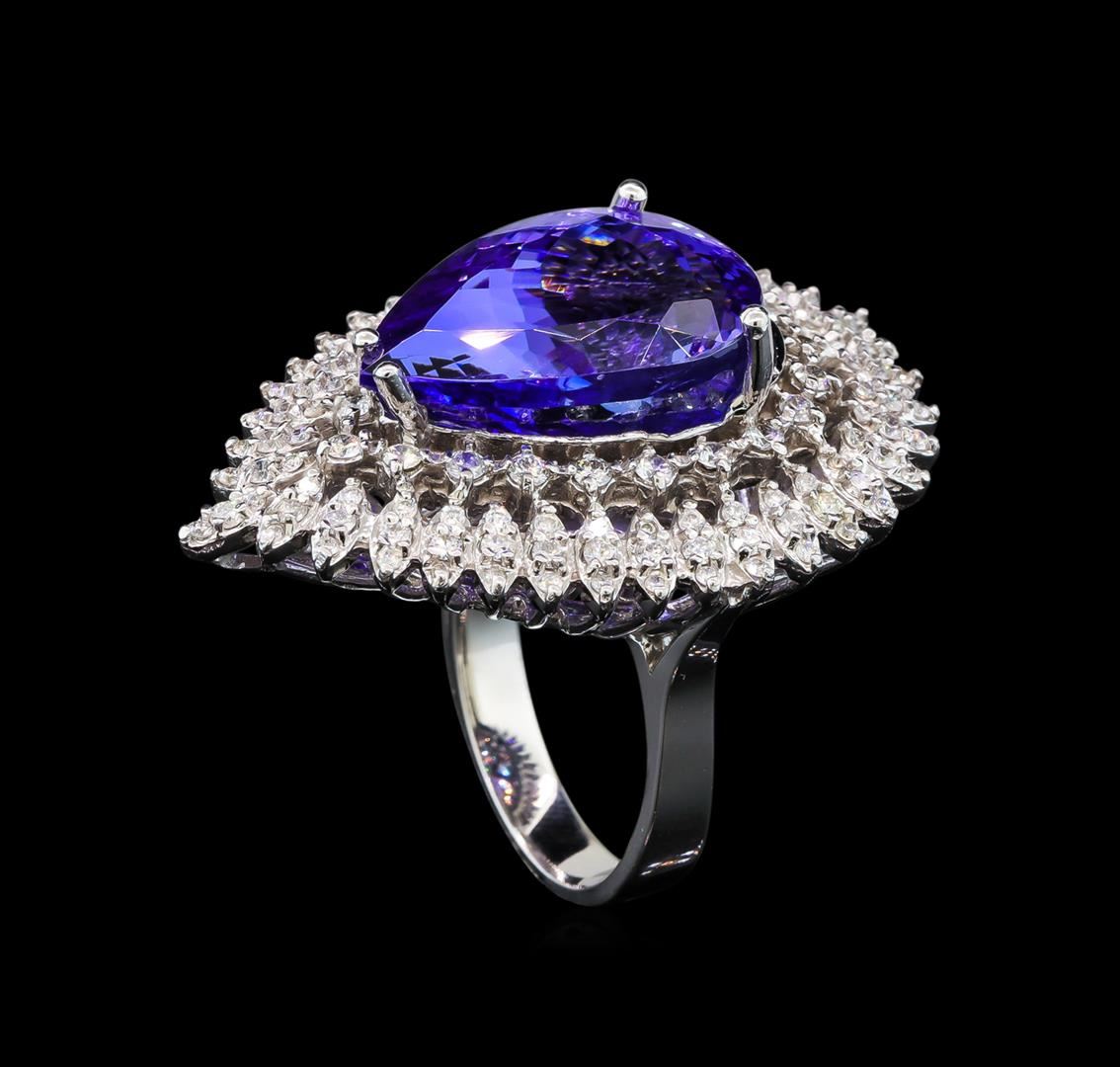 One electronically tested 14KT white gold lady's cast fashion ring with a basket halo with a bright polish finish. The featured lady's ring has a shank measuring 3.50 millimeters wide. Identified with markings of 'K14'. Condition is new, good workmanship. Containing: One prong set pear modified brilliant cut natural tanzanite, measuring 19.48 x 14.20 x 10.51mm, (depth est.) approximate weight of 19.38ct., clarity is eye clean, medium, moderately strong, violet color, (GIA V 5/4), cut is very good. Transmitting light with no distortion, transparent. Colored gemstones are presumed to have been subjected to commonly used enhancement processes. Graded loose prior to setting in the GIA Laboratory, Report #1172668615. Twenty-One prong set round brilliant cut diamonds, measuring 2.00 - 1.90 x 1.21mm (depth est.) approximate total weight of 21 Stones = 0.59ct. Graded in the setting. Clarity SI-1 to I-1. Color: H - I Cut Good Thirty-Six prong set round brilliant cut diamonds, measuring 1.45 - 1.35 x 0.87mm (depth est.) approximate total weight of 36 Stones = 0.37ct. Graded in the setting. Clarity SI-1 to I-1. Color: G - I Cut Good Seventy-Two prong set round brilliant cut diamonds, measuring 1.20 - 1.10 x 0.71mm (depth est.) approximate total weight of 72 Stones = 0.41ct. Graded in the setting. Clarity SI-1 to I-1. Color: G - I Cut Good. Total Weight of Colored Stones 19.38ct.. Total Weight of Diamonds 1.37ct.. Total Weight of Ring 16.10gm. GAS Appraised at $31,490.00.